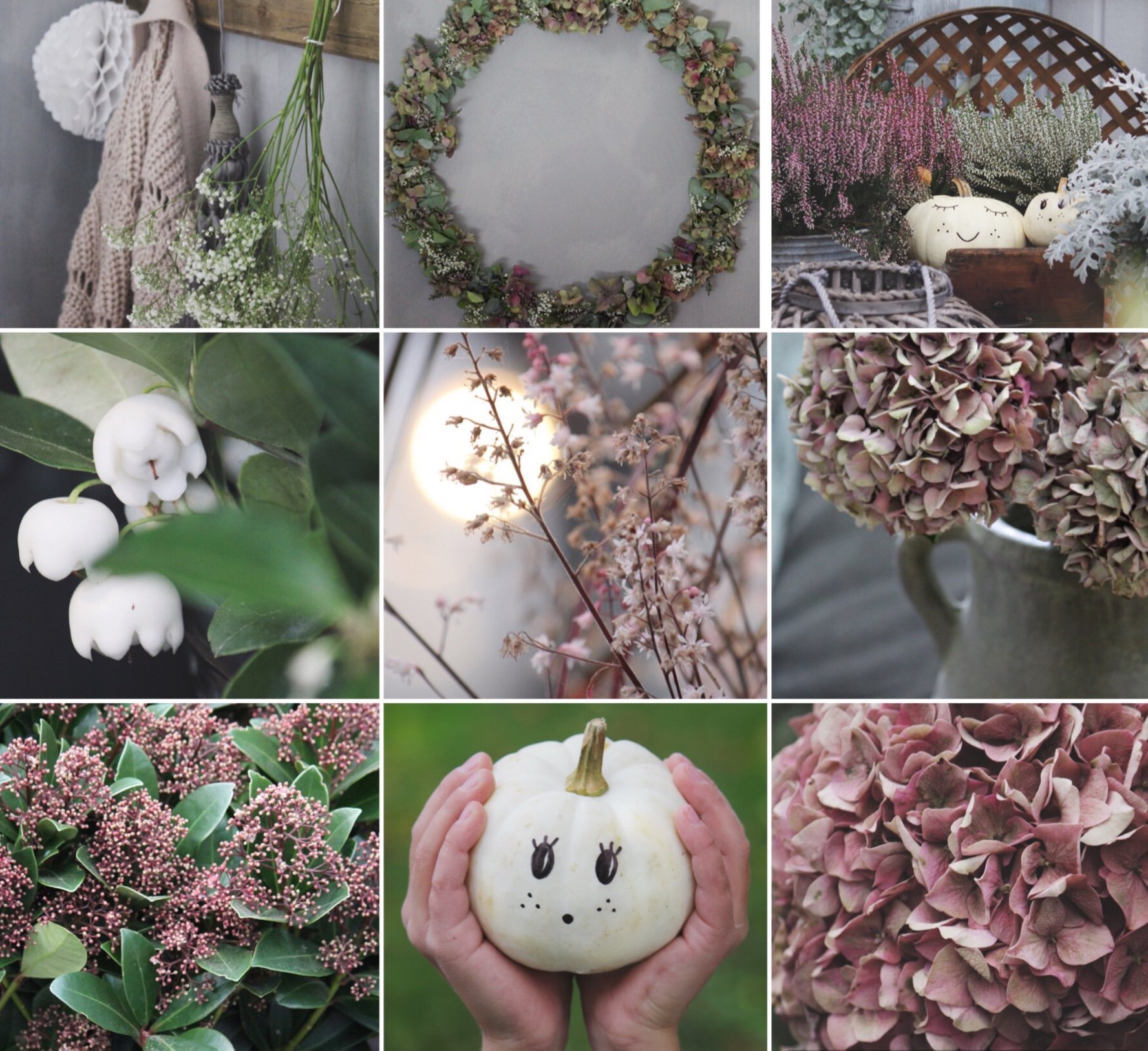 Färgerna går i mörkrosa och silvergrönt. Frossar i hortensia, lavendel och torkade växter. Snälla pumpor flyttar in i trädgården. Halloween hoppar vi över. Renovering av hallen påbörjas och jag tar hem tapetprover.