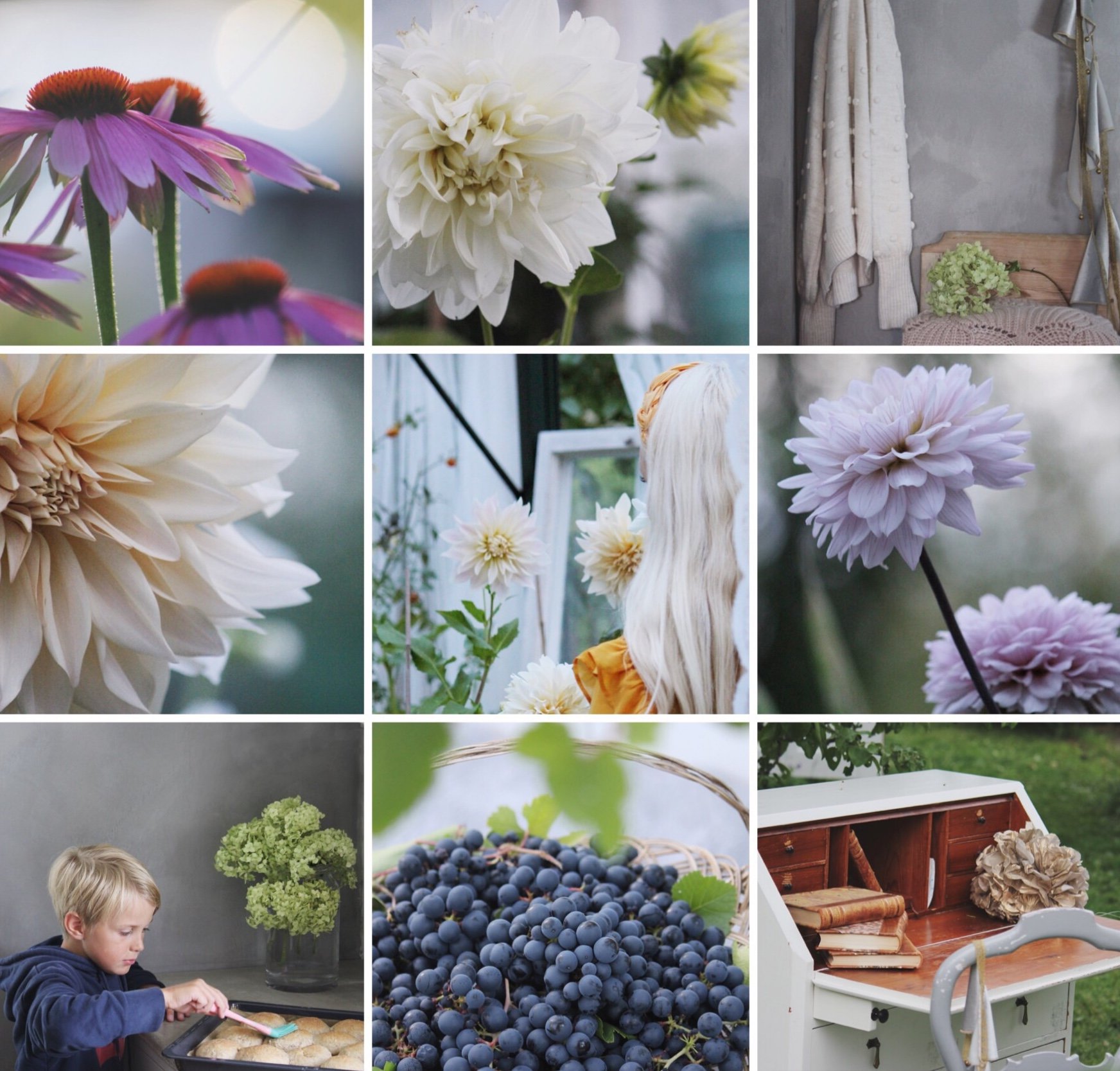 Skördetid i trädgården. Vi har nog aldrig fått så mycket vindruvor som detta år. Galet mycket Vi gav bort en hel del men lyckades inte ta vara på allt. Vi har druvor både på friland och i växthuset. Dahliorna frodas och är så ljuvliga. Jag går ut till växthuset varje dag för att upptäcka nya sorter. Jag målar och tar hans om gamla möbler som vi fått efter Eriks mor och farföräldrar från Hälsingland.