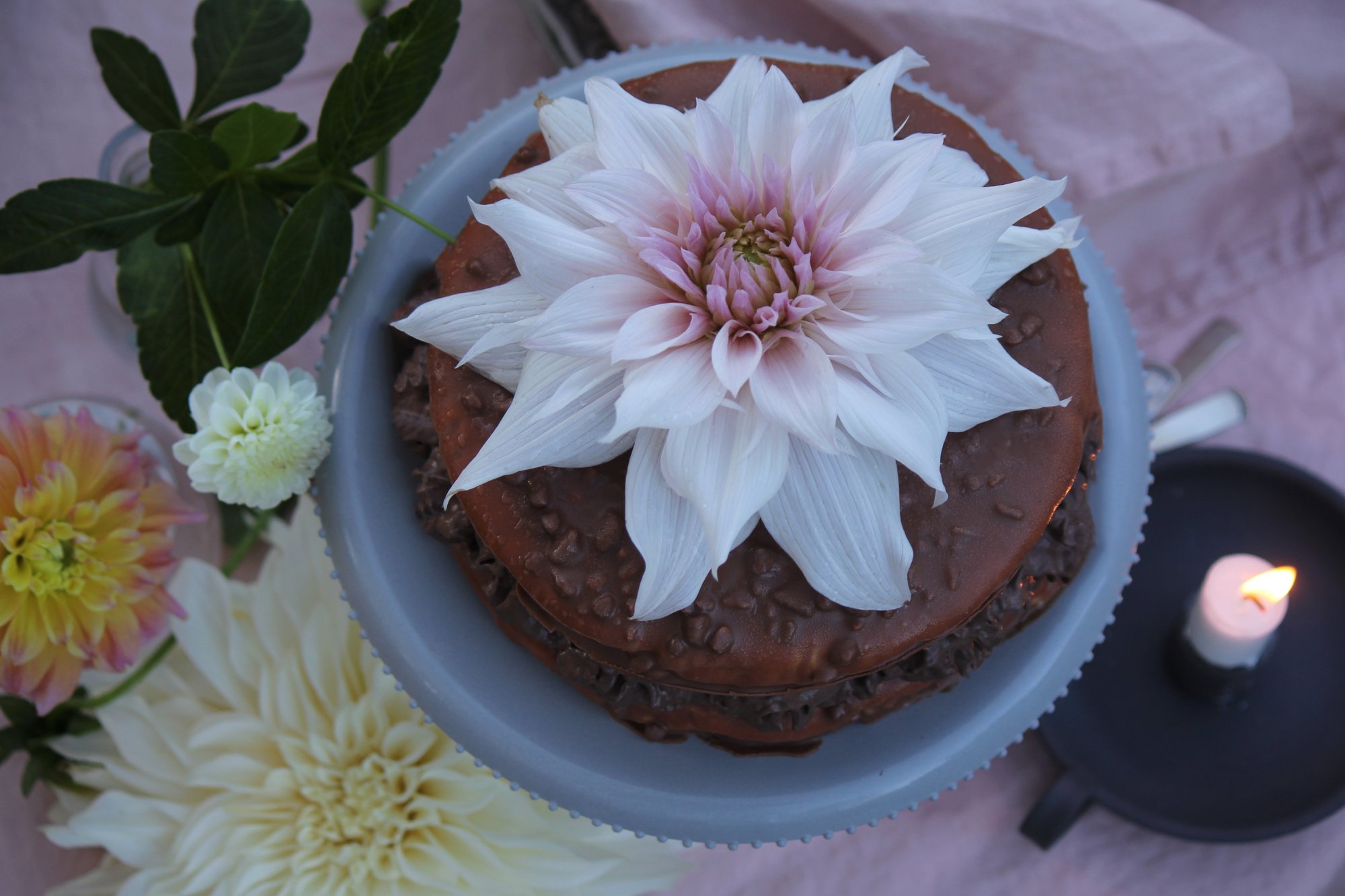 Vi dukade upp till tårtkalas i helgen intill blommande dahlior. Otroligt att de kan blomma i Oktober men så har det också varit en varm höst. Vi köpte två daimtårtor och hade chokladmousse mellan bottnarna. Dekorerade med en stor, vacker dahlia för att få den att se lite lyxig ut! Tårtorna kan man verkligen dekorera enkelt med t.ex. bär, en blomma, maränger, grädde, vimplar o.s.v. Som jag längtat efter att få göra detta roliga fotojobb!