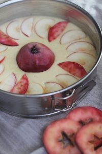 September är här och vad passar då inte bättre än att baka en äppelkaka och ta vara på våra äpplen i trädgården. Har man inte trädgård så säljs alldeles ljuvliga svenska äpplen i butik nu. Våra röda äpplen från trädgården är sorten Veiniöun som kommer från en plantskola i Estland. Älskar färgen på skalet och fruktköttet är alldeles rött. Gör man mos får man röd äppelmos. Vi har många äppelsorter i trädgården men i år har det inte varit lika mycket frukt som det brukar. Det varierar år från år tycker jag. Här kommer receptet!
