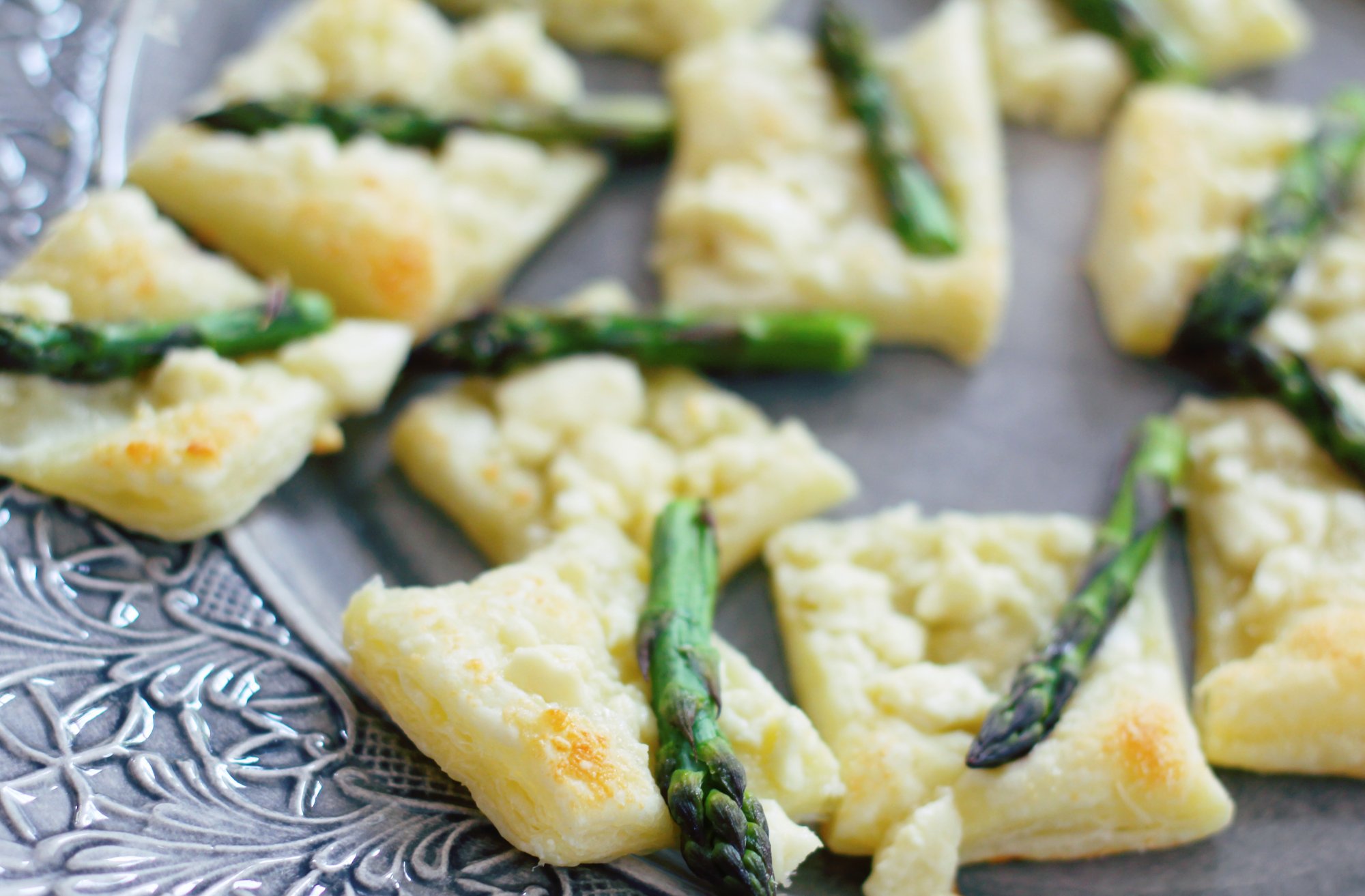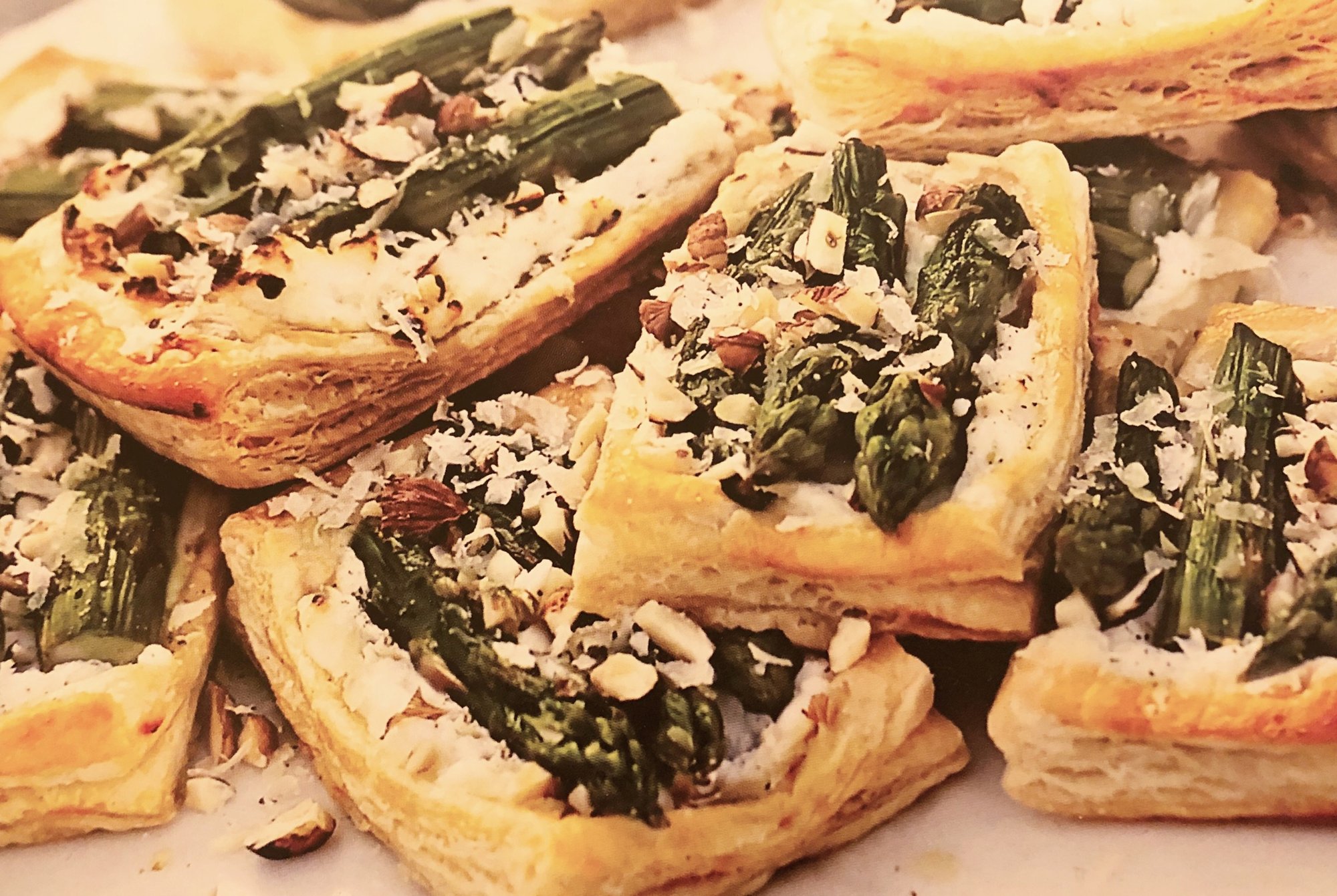 Lättfixade vegetariska snittar till festen med smördeg, fetost och färsk sparris. Kan man annat än att älska färsk sparris. Om sommaren så odlar vi egen och passar på att skörda den fram till midsommar men man kan hitta fin ekologisk sparris i matbutiken redan nu. Välj gärna de som är lite smalare och mindre. De har mer smak tycker jag och blir bättre i konsistensen.