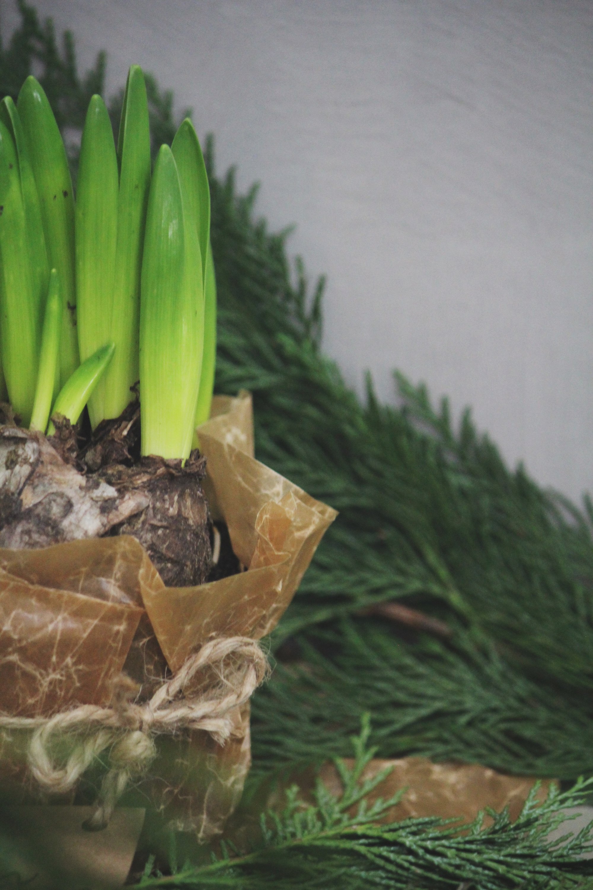 Visst är det roligt att ha med sig en liten gå-bort-present när man är bjuden på glöggmingel, julmiddag eller likande. I mitt förra blogginlägg skrev jag om tips på enkla buketter som du kan binda hemma och ge bort. Ett annat tips är att köpa vaxat papper. Du knölar det och binder det runt en vacker julblomma. Det blir jättefint. Här är det en hyasint med flera mindre blommor i samma. Jag köpte vaxat papper på vår plantskola.