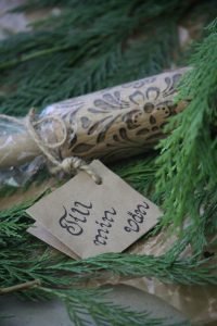 Ett annat tips är dessa mönsterkavlar. Du hittar dem hos Fru Nypon. Den här har jag slagit in i lite prasslig celofan för att få den extra festlig.