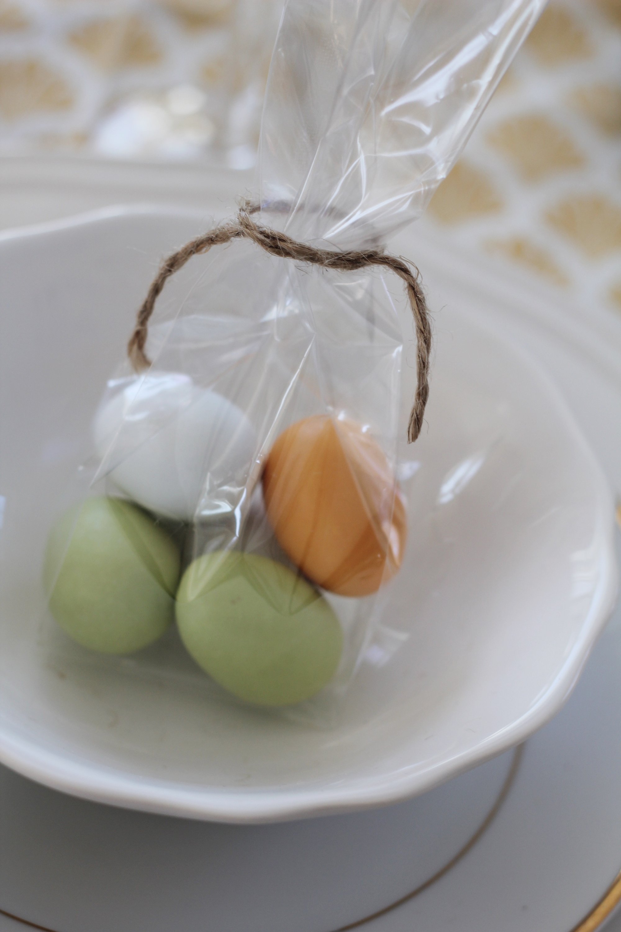Äggen har jag slagit in i små påsar av cellofan och knutit jutesnöre runt.