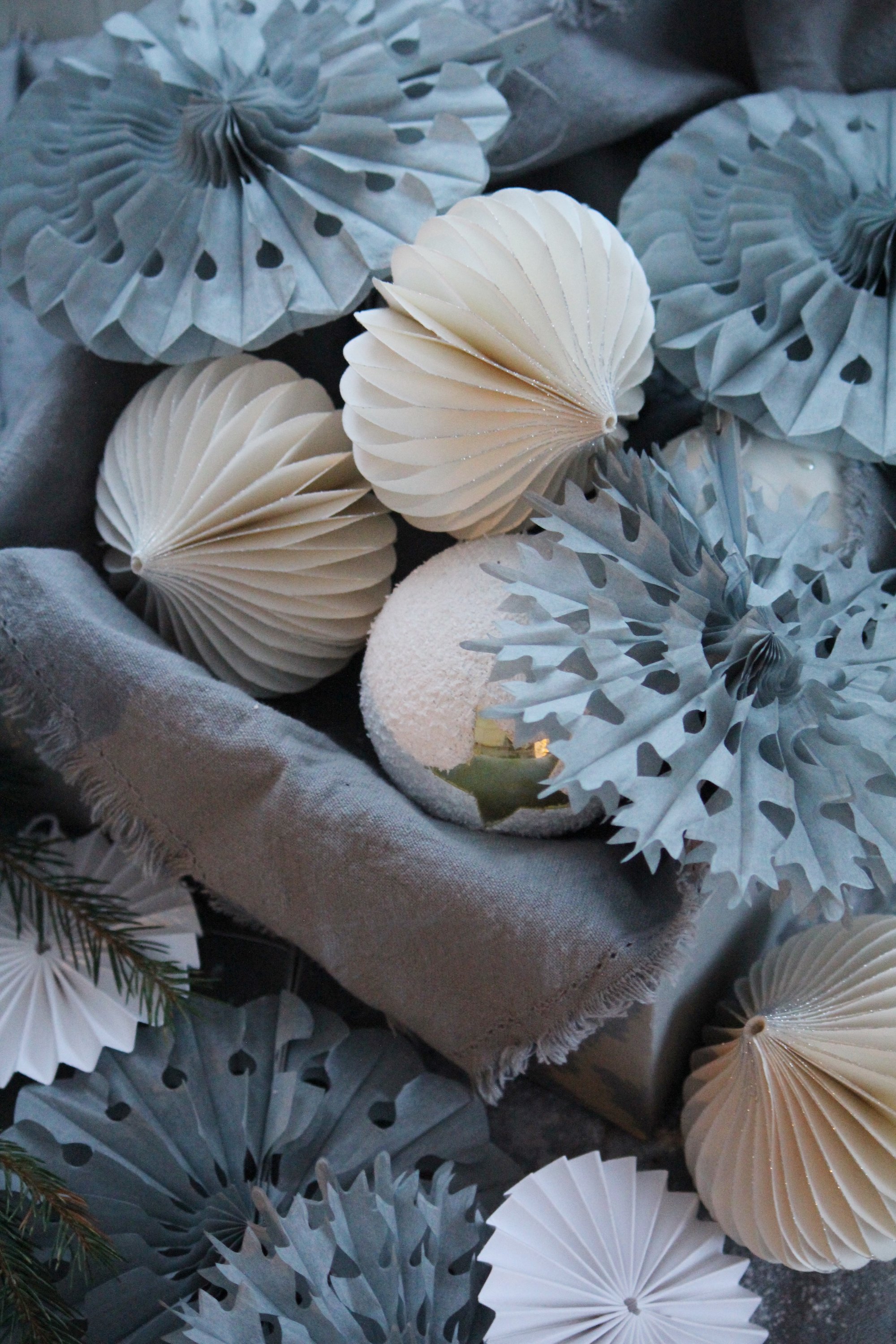Här är årets granpynt hemma hos oss. Du hittar dem hos HM Home, Lagerhaus och de grå är House Doctor. Jag tycker om de där vikta pappersdekorationerna. Så blir det julgranskulor med namn också.