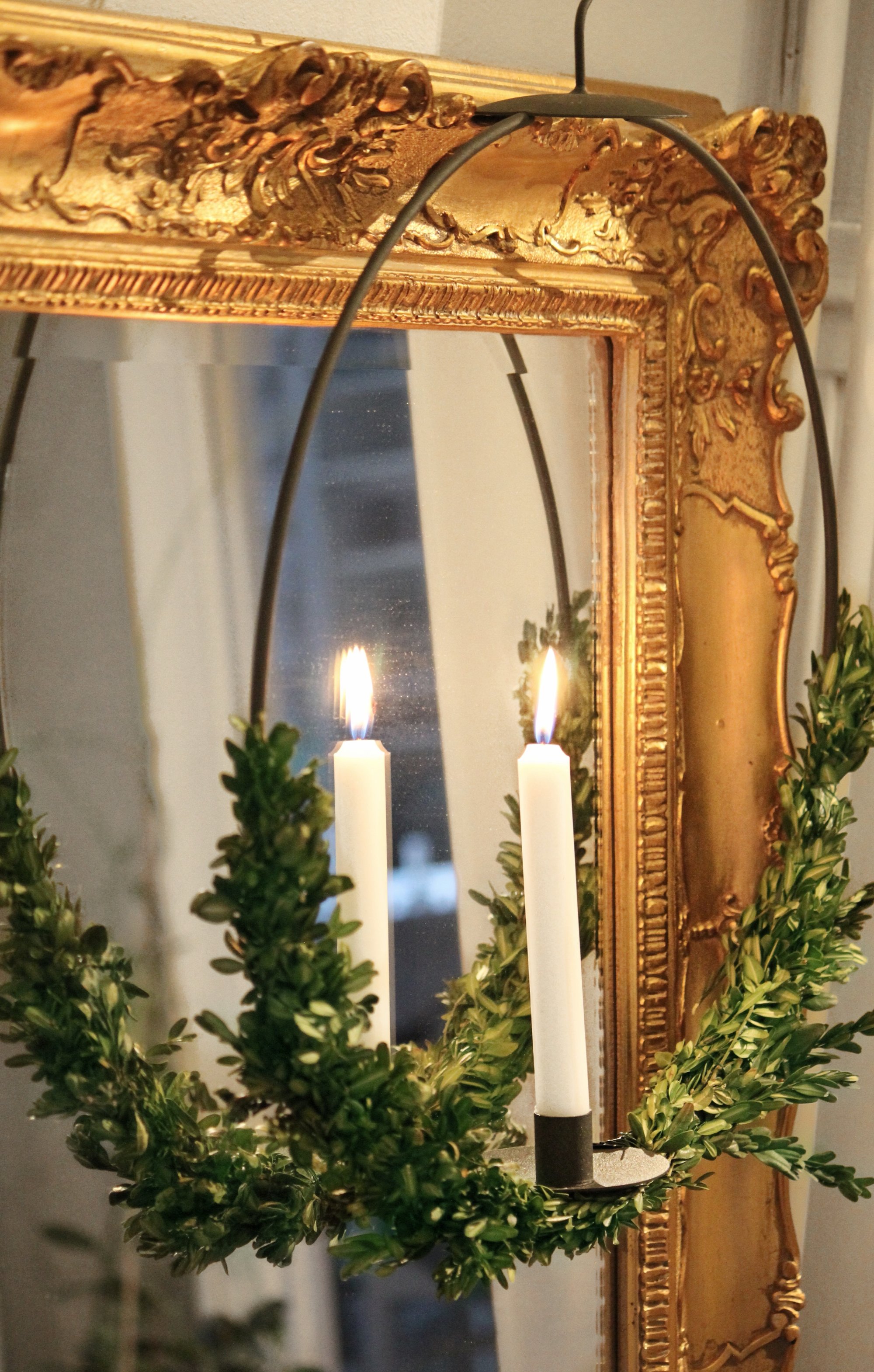 Det kommer såklart bli tomte, julberättelse och Kalle Anka också hemma hos mina föräldrar där vi kommer vara på dagen. Min bror kommer hem från Litauen så det är något jag ser fram emot lite extra. Kanske tar de med sig lite julmat från Litauen. Kransar är något jag älskar. Den här har jag gjort enkelt med lite buxbom från trädgården. Finns att köpa i lösvikt på plantskolor och blomsteraffärer. Står sig grön länge! Den stora kransen som ni ser på bild 1 som hänger över köksbordet har jag gjort av en rockring och sedan bundit granris runt om. Knutit tre snören och hängt upp den i taket. Den är pyntad med ett snöre med guldstjärnor.