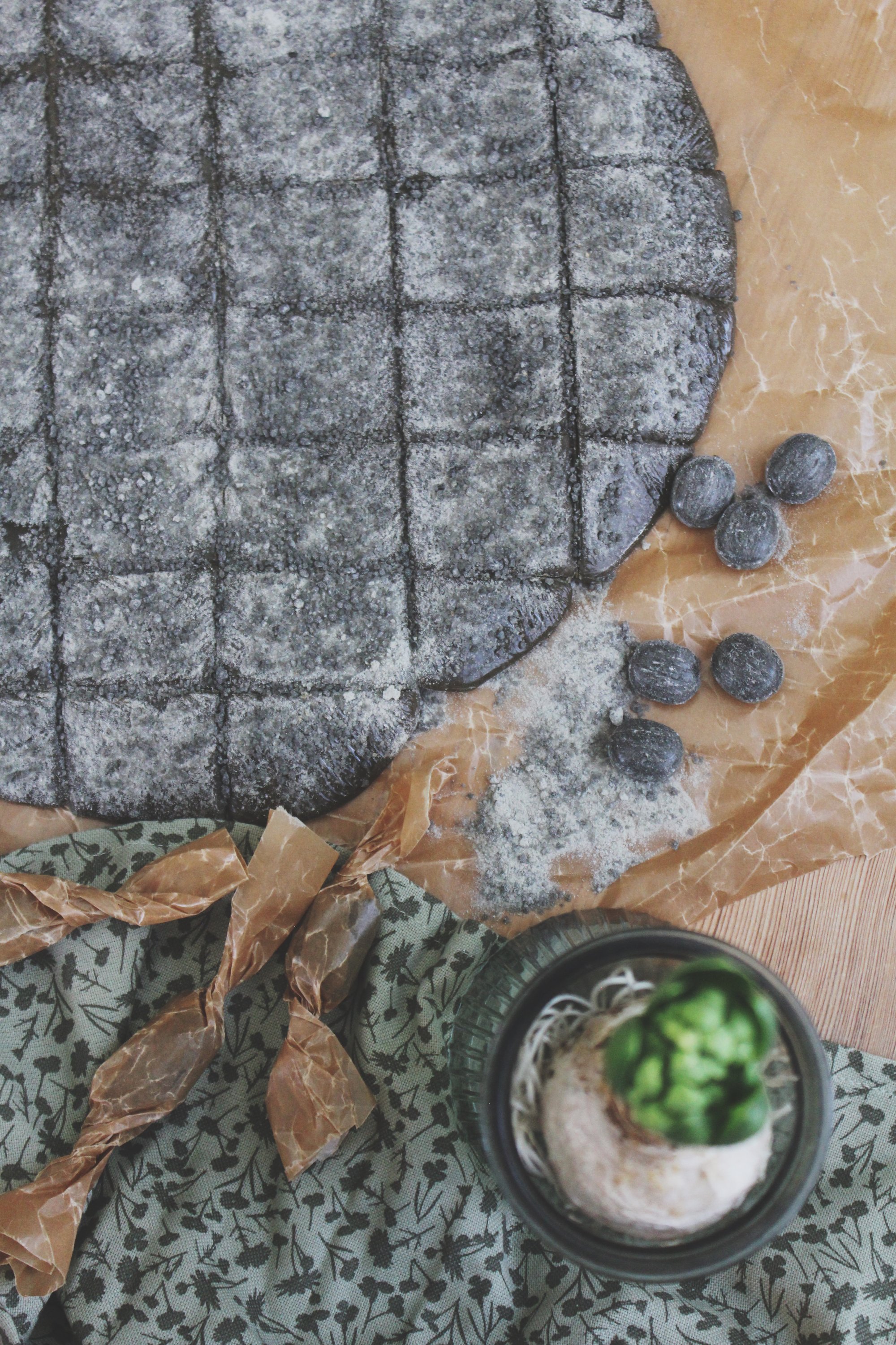 Häll upp på en plåt med bakplåtspapper. Strö över pulver av turkiskt peppar. Spara en del. Låt kolan svalna innan du skär den i bitar. När du sedan snurrar in varje del i mindre bitar av bakplåtspapper (till kolor) har du turkisk peppar-pulver i mitten av kolorna.