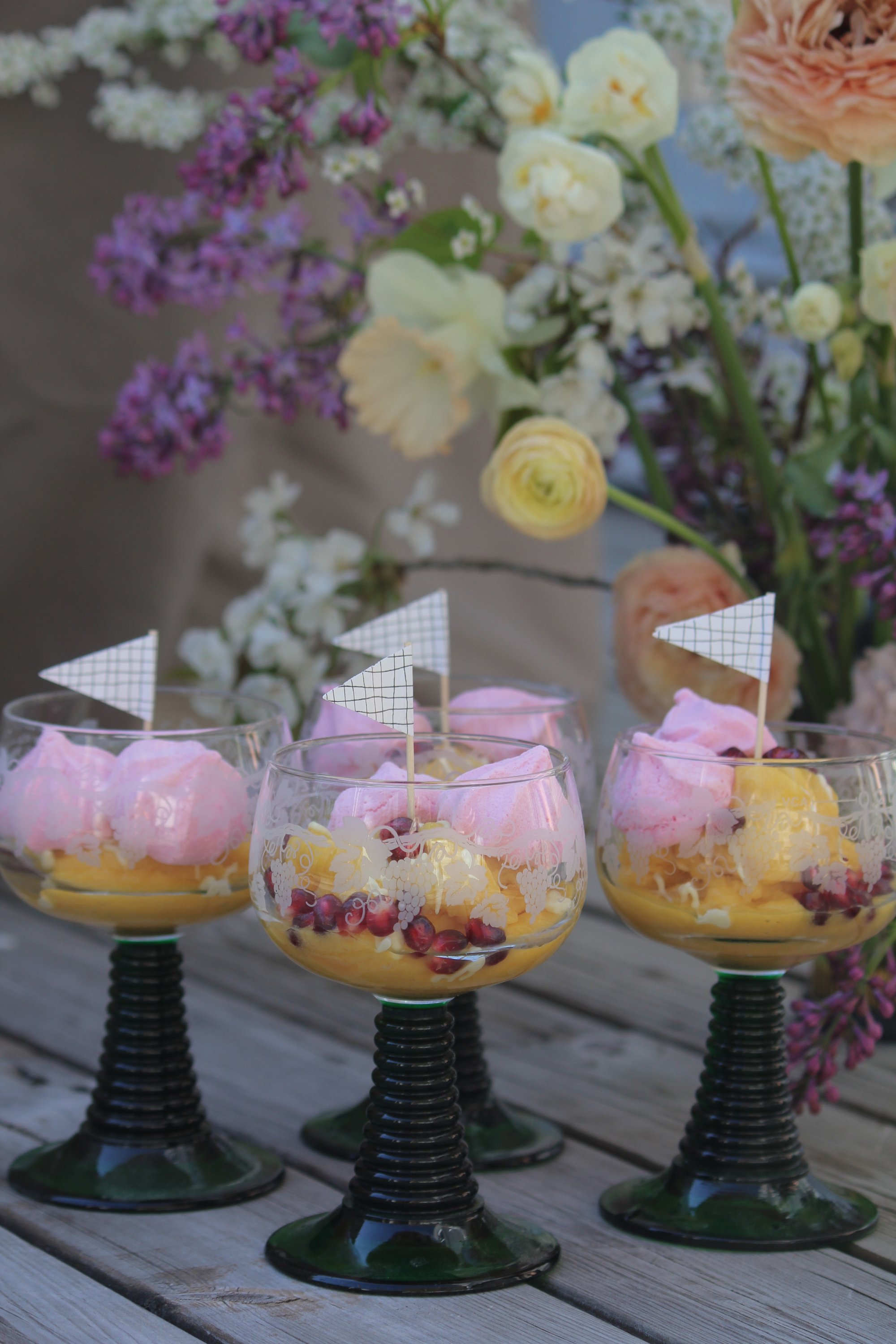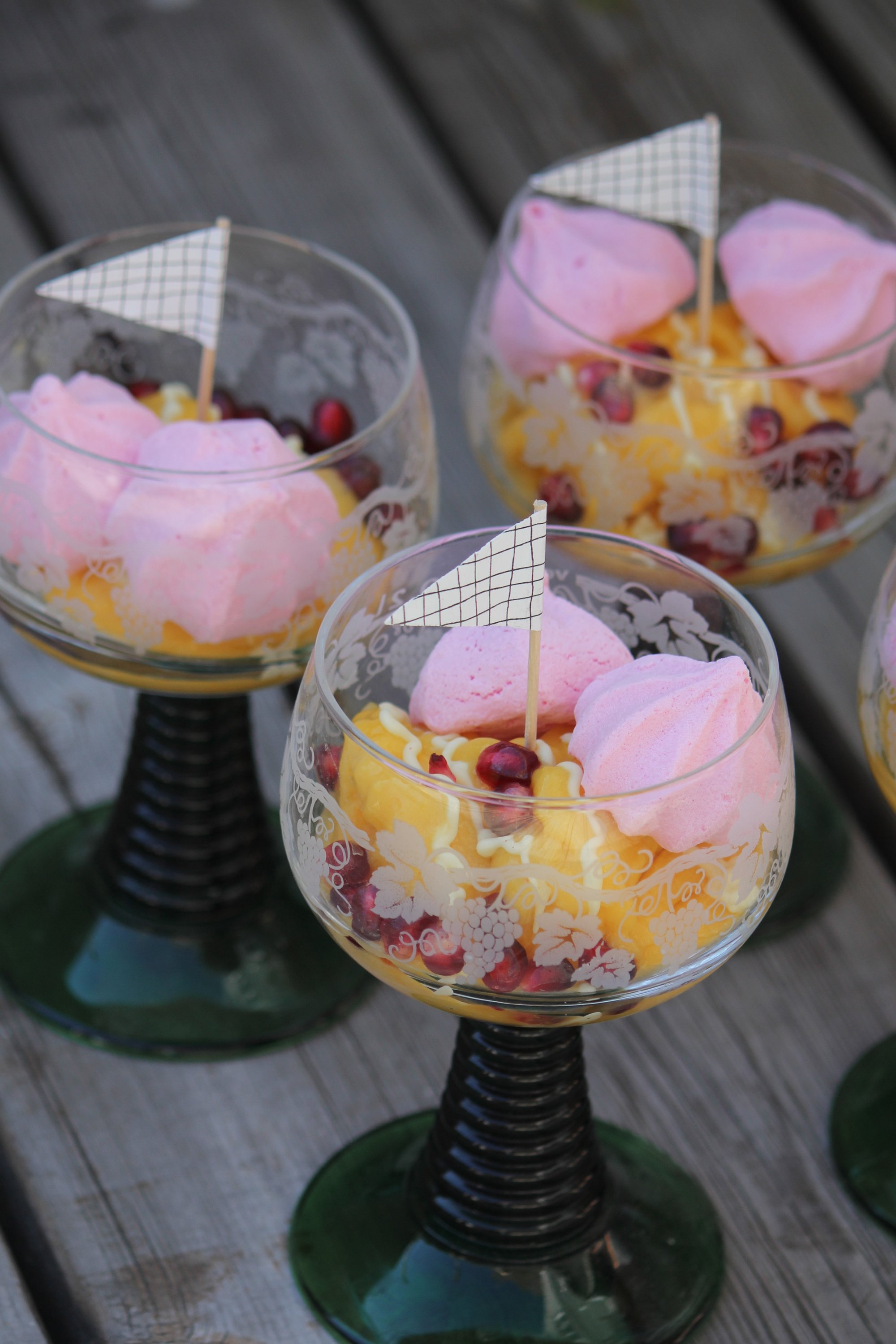 Dekorera med marängerna och granatäppelkärnor. Servera direkt!
