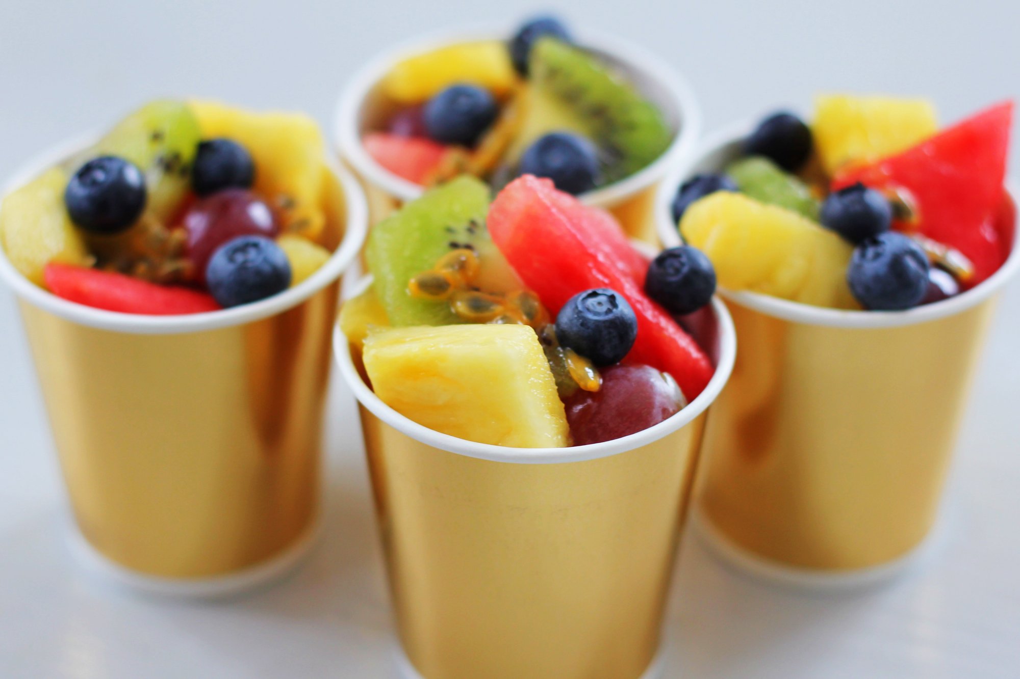 Lite god frukt i minimuggar. Tema guld på dukningen.