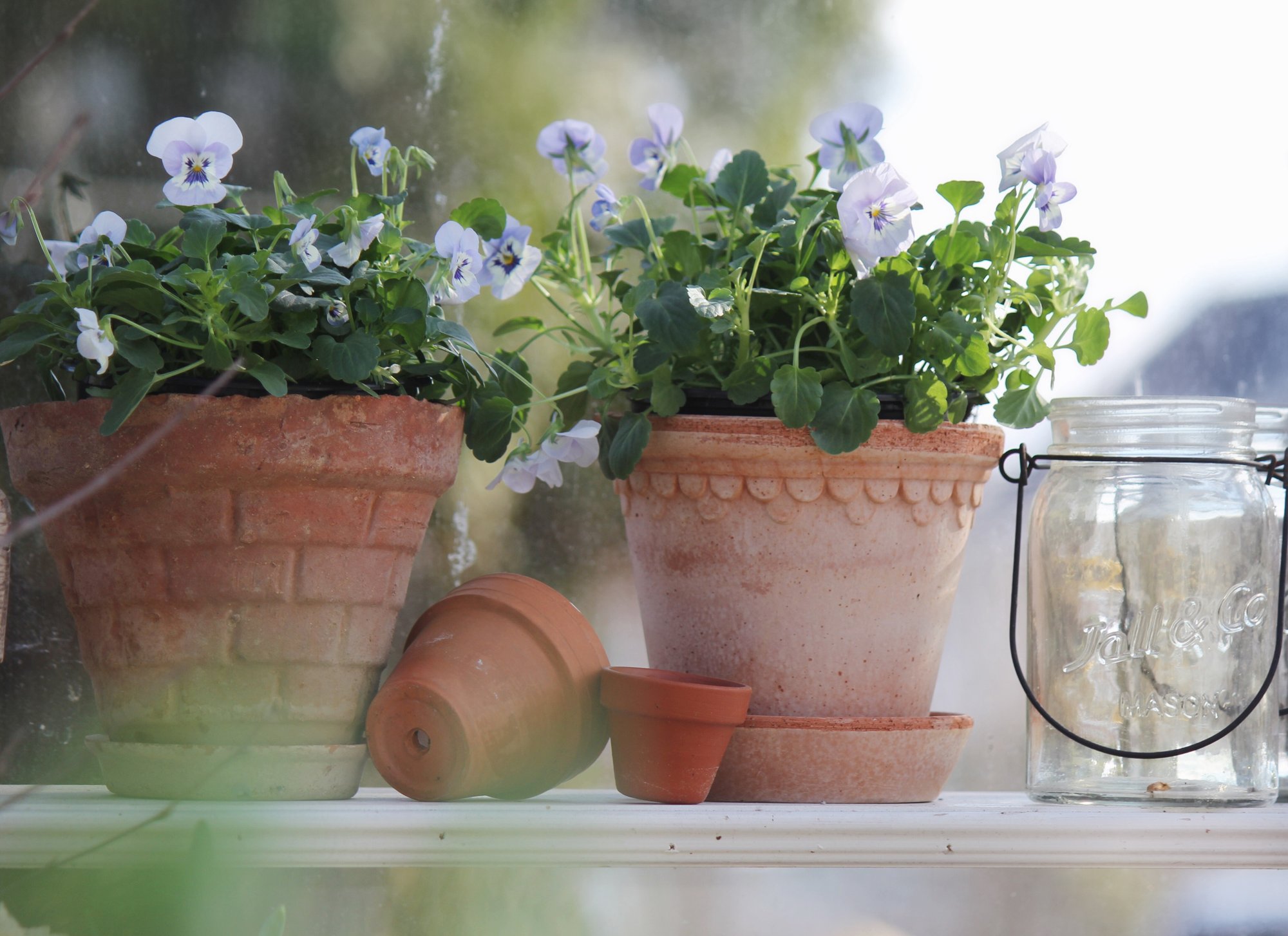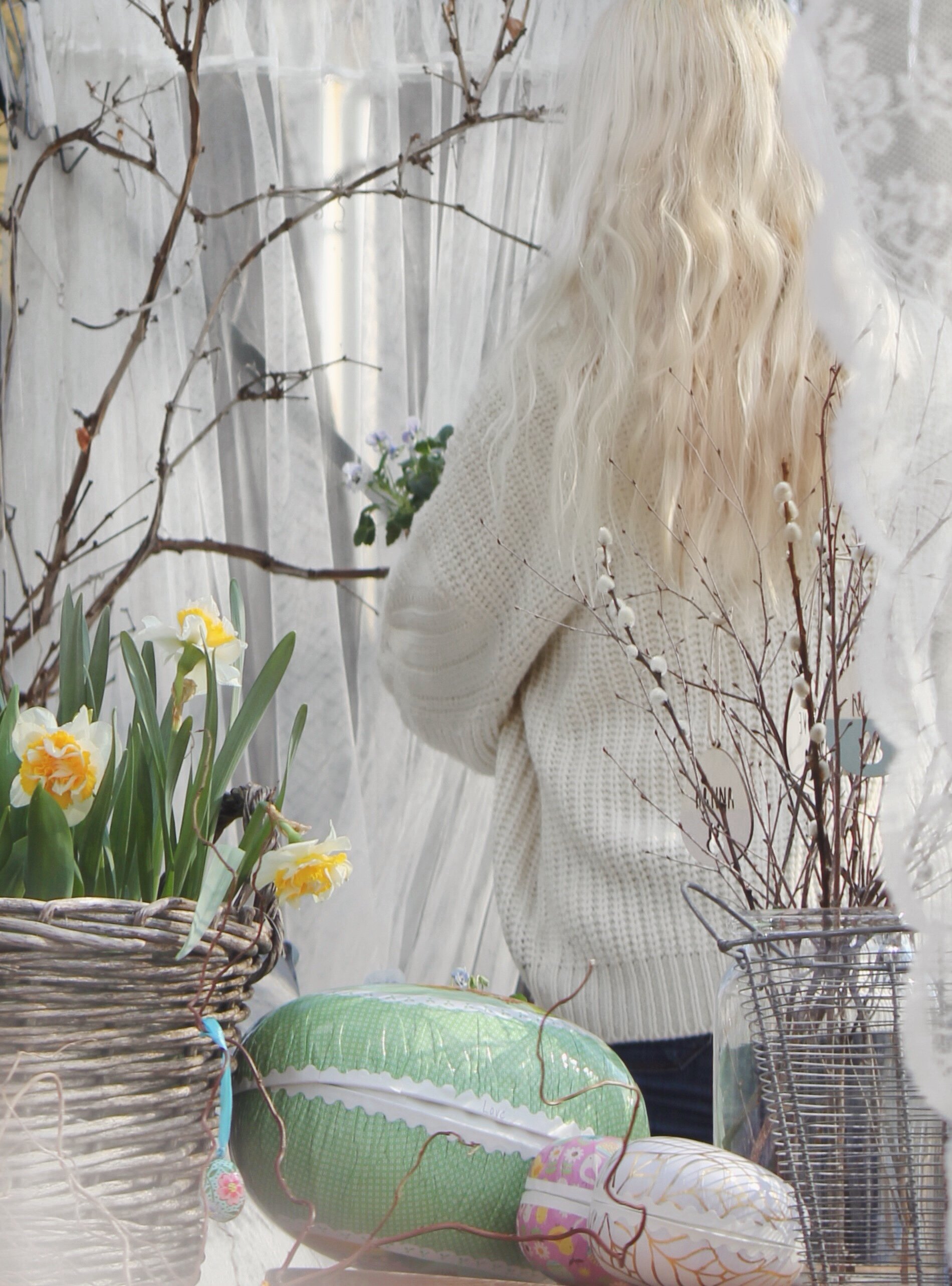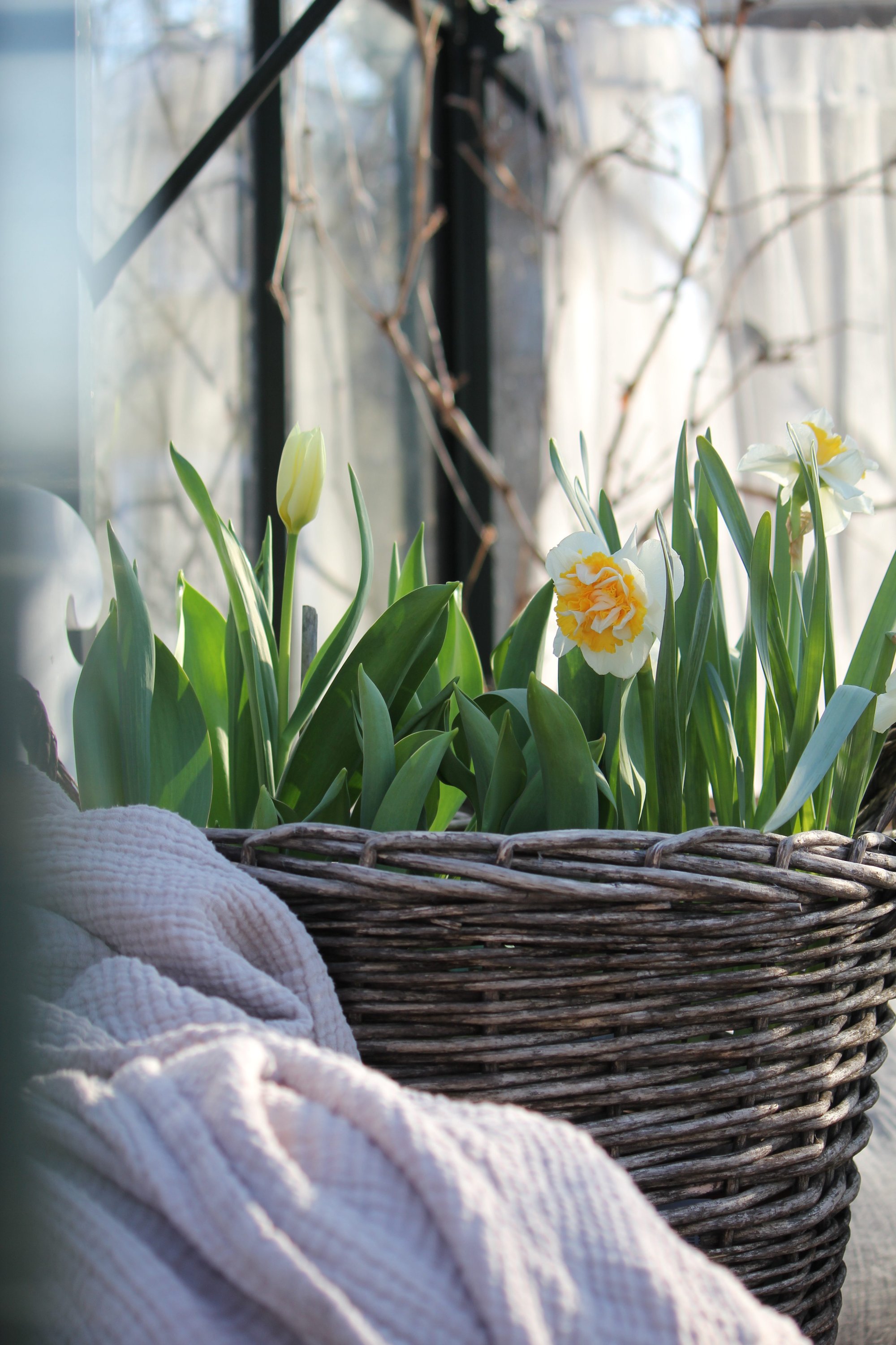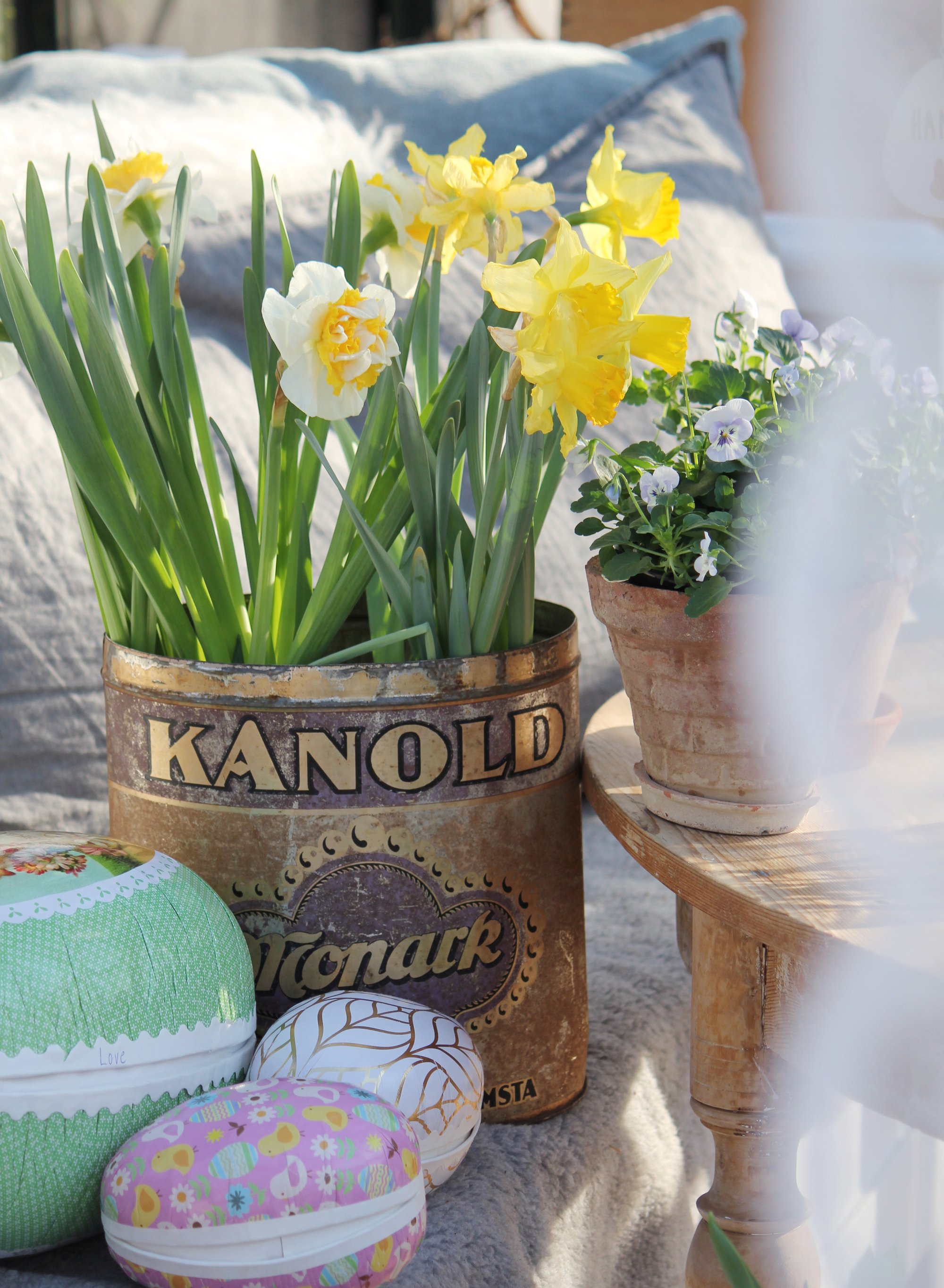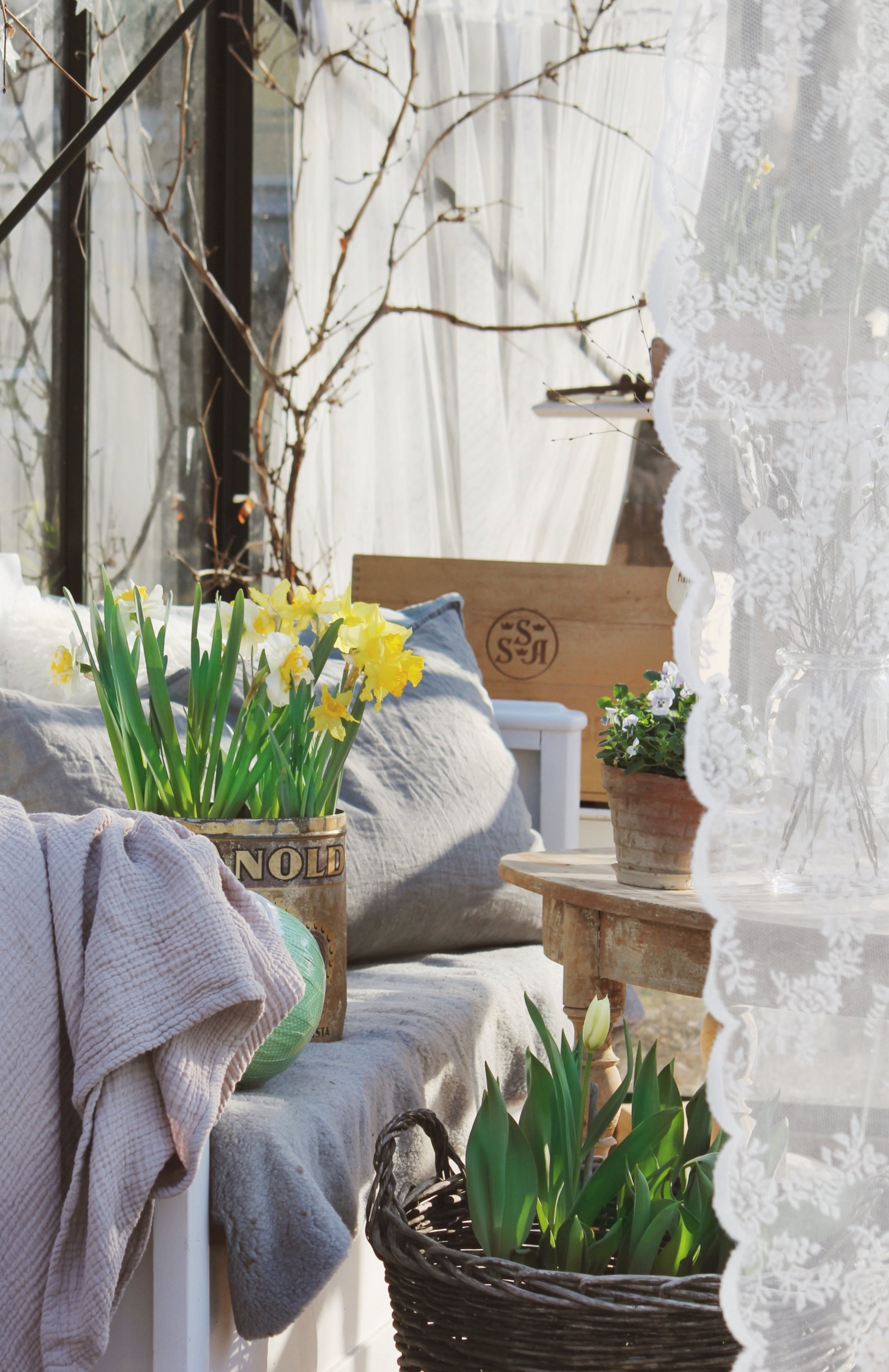 Idag har jag pyntat lite påsk i vårt växthus. Tarzetter och påskliljor i gamla kakburkar som jag fyndat på loppis. Korgar med tulpaner som jag planterade i höstas. Krukor från Ulriksdals trädgård med isblå våriga penséer. En spetsgardin som skapar en ombonad känsla i det annars ganska kala växthuset.