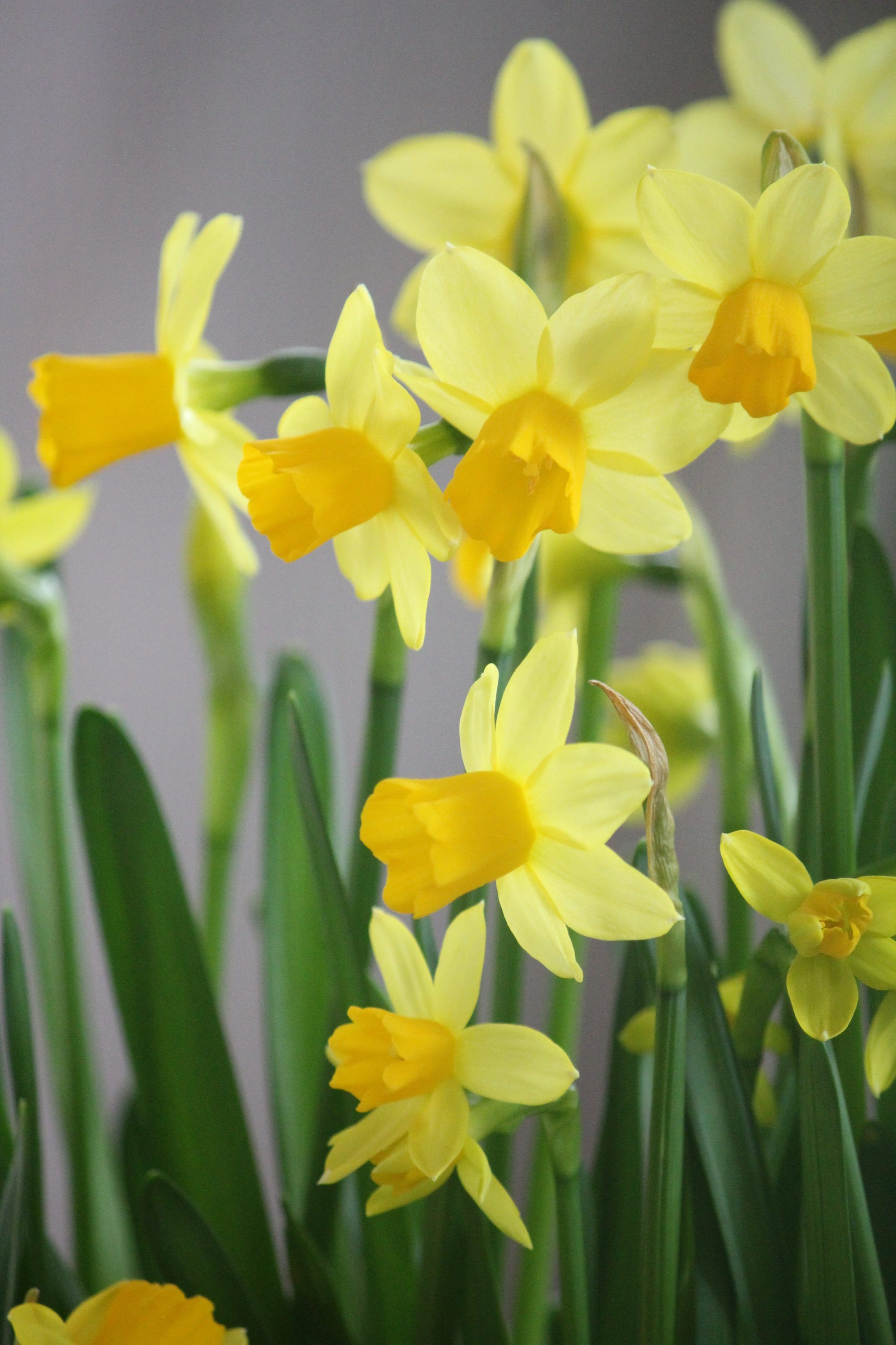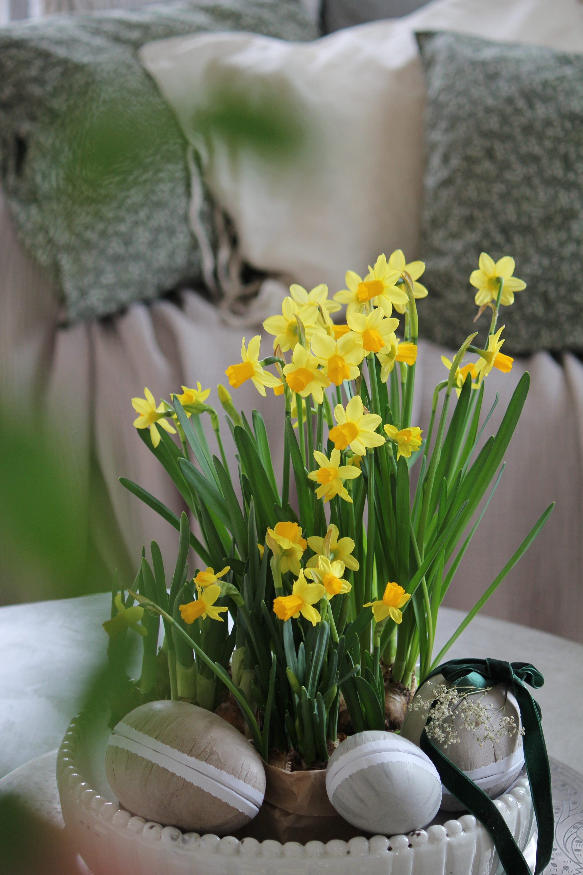Ett enkelt påskigt blomsterarrangemang fixar du genom att plantera minipåskliljor och Tazetter i en stor skål. Jag har pyntat med naturfärgade ägg.