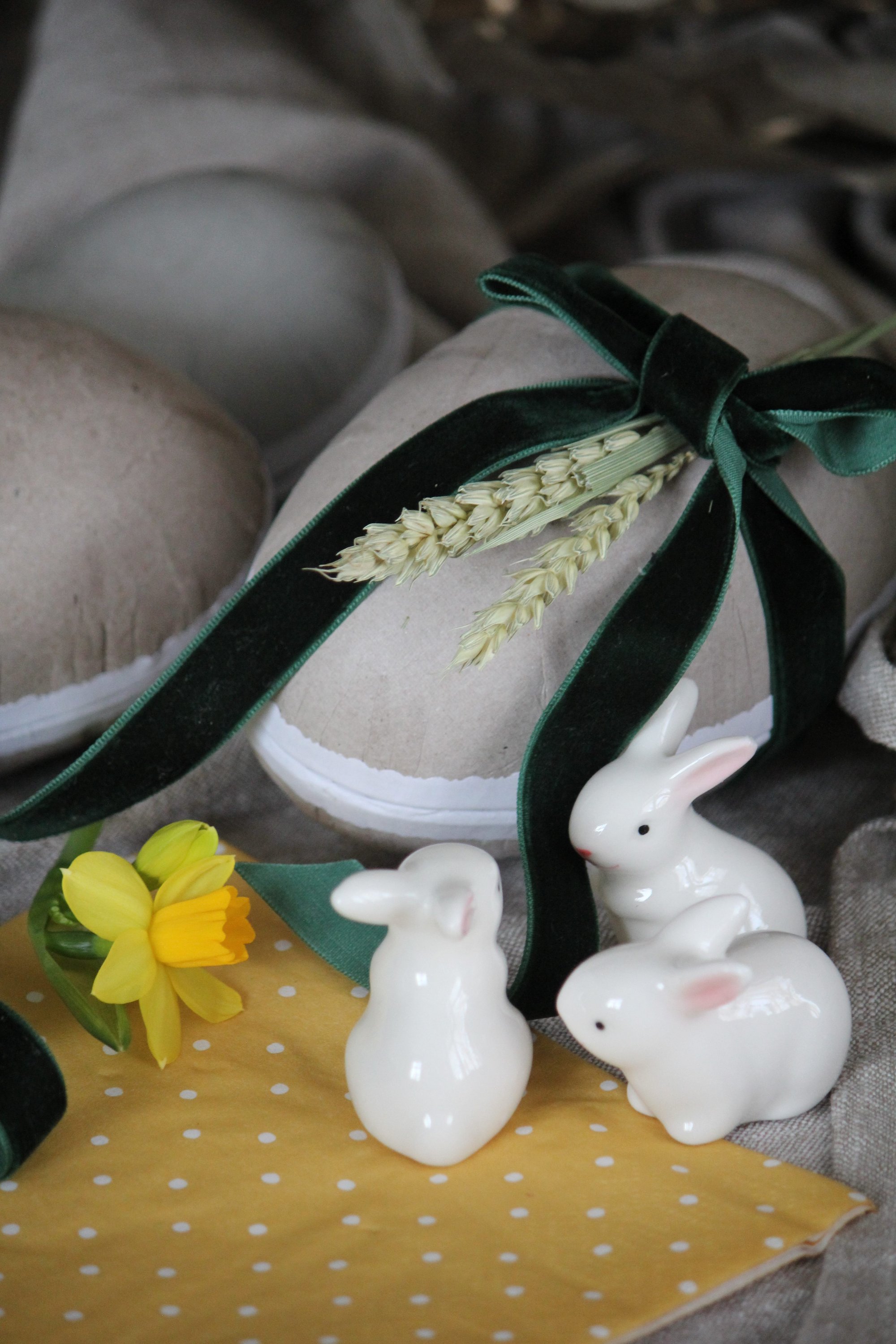 De gula påskiga servetterna med vita prickar hittar du här. Naturfärgade påskägg är så fina tycker jag. Jag har pyntat dem med ett mörkgrönt sammetsband och några torkade dekorationer från i somras. Påskäggen har jag köpt på Panduro.