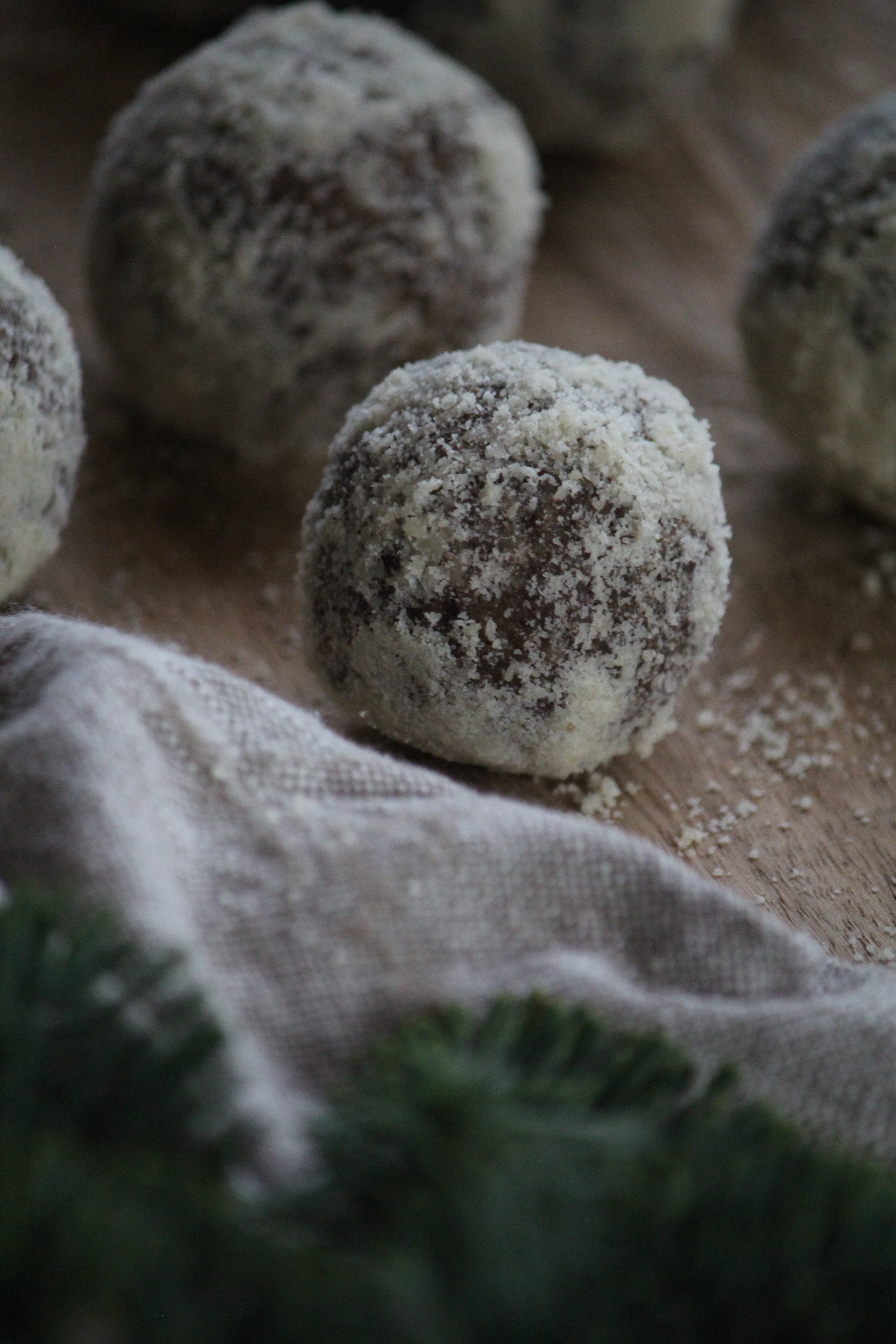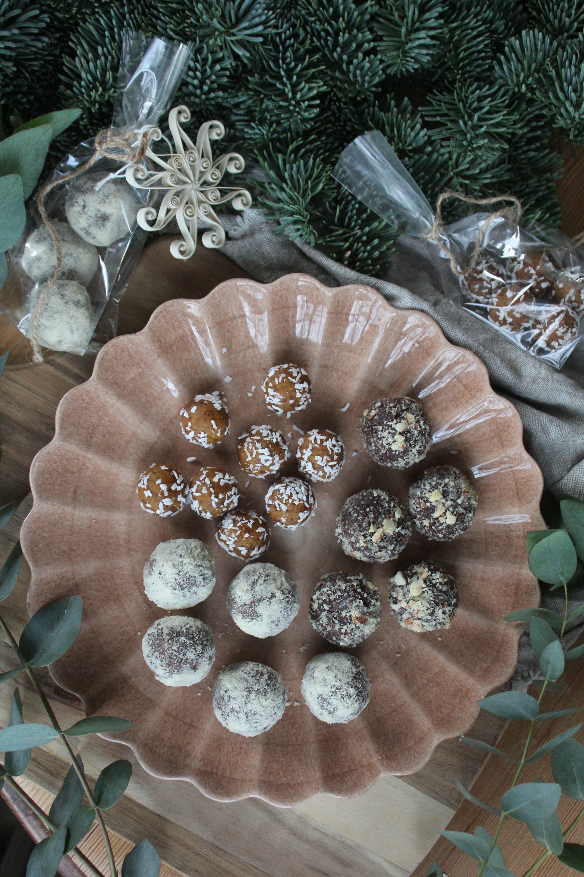 Gör så här: Mixa ingredienserna i en hushållsmixer och tillsätt sedan vatten till mjuk konsistens. Rulla till bollar. Jag rullade sedan bollarna i lite mandelmjöl. Ställ in i kylen.