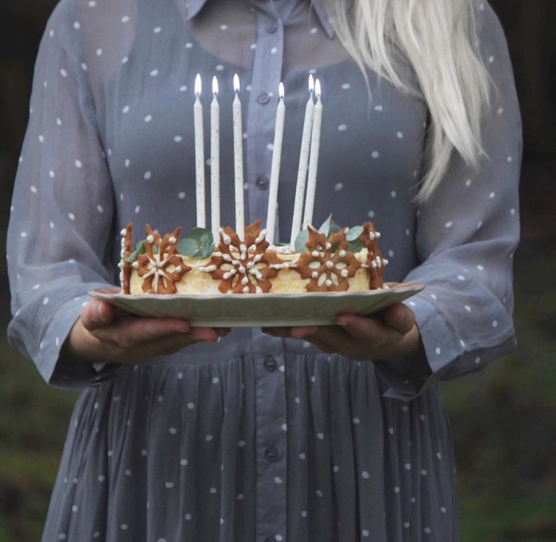 7. Dekorera tårtan när du tar fram den ur frysen. Den här har jag dekorerat med pepparkakssnöflingor som jag bakat tidigare men det är också fint att dekorera med t.ex. lingon eller varför inte halverade färska fikon och physalis. Eventuellt behöver den ställas fram lite innan man ska äta den ifall den är helt genomfrusen. Det är lite olika på olika frysar har jag märkt. Idag tog vi den direkt från frysen och den var lagom mjuk.