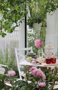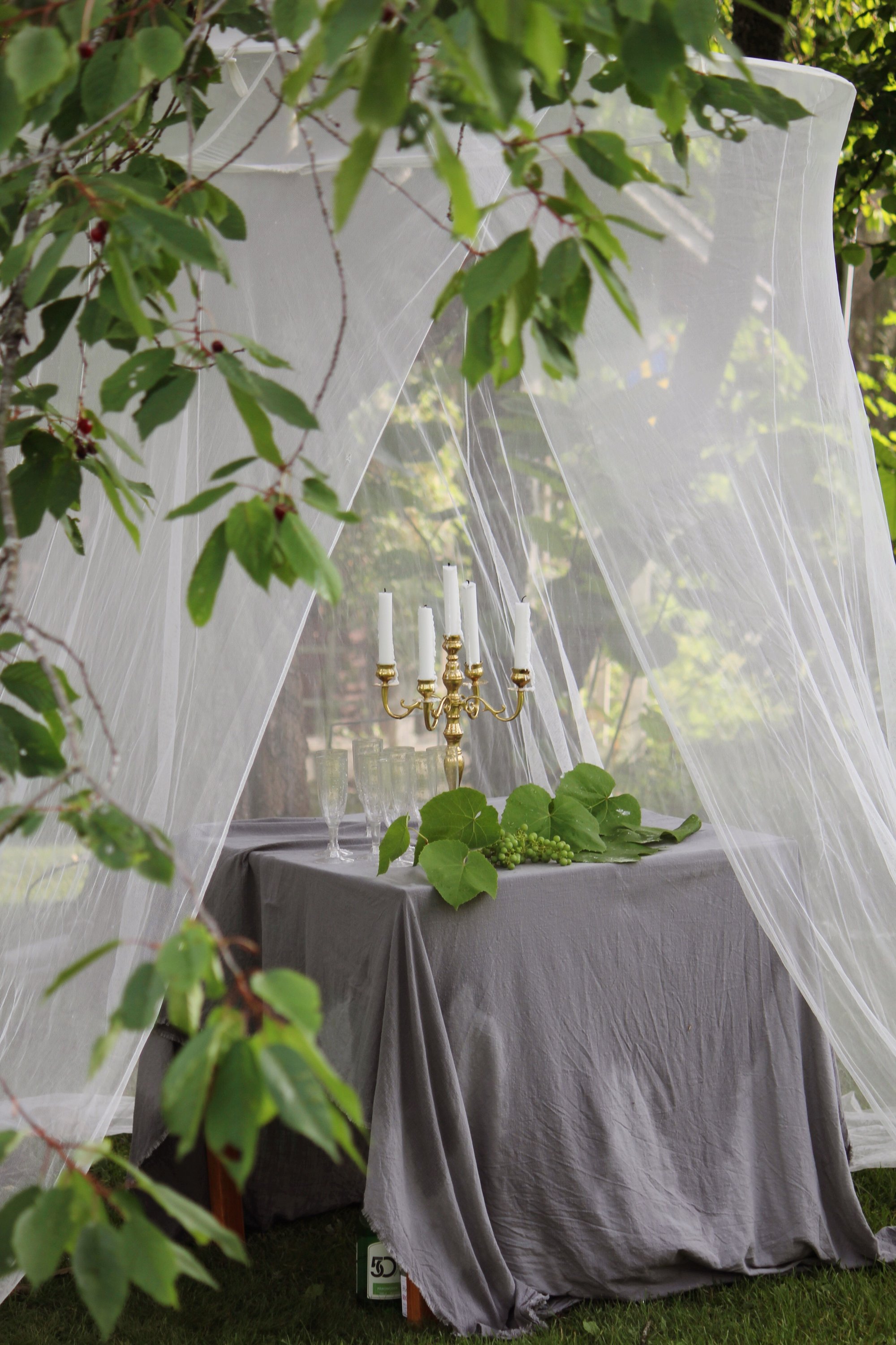 Tänkte dela med mig av lite inspiration till trädgårdsfest då vi hade en släktfest hemma hos oss i Lördags. Jag älskar att fixa i trädgården och trots lite regn blev det en jättefin dag. Försökte skapa olika trädgårdsrum där gästerna skulle kunna sitta. Här är vår pergola med en stor vinranka som klättrat över taket och bildat ett mysigt litet kryp in. I taket hänger vindruvor och lyktor. Köpte en guldvimpel på Lagerhaus och en grå duk på Åhlens. Möblerna hade vi sedan tidigare. Brukar ofta tänka på komplementfärger när jag dekorerar. Därför ställde jag dit en lila hortensia som förstärker det gröna.