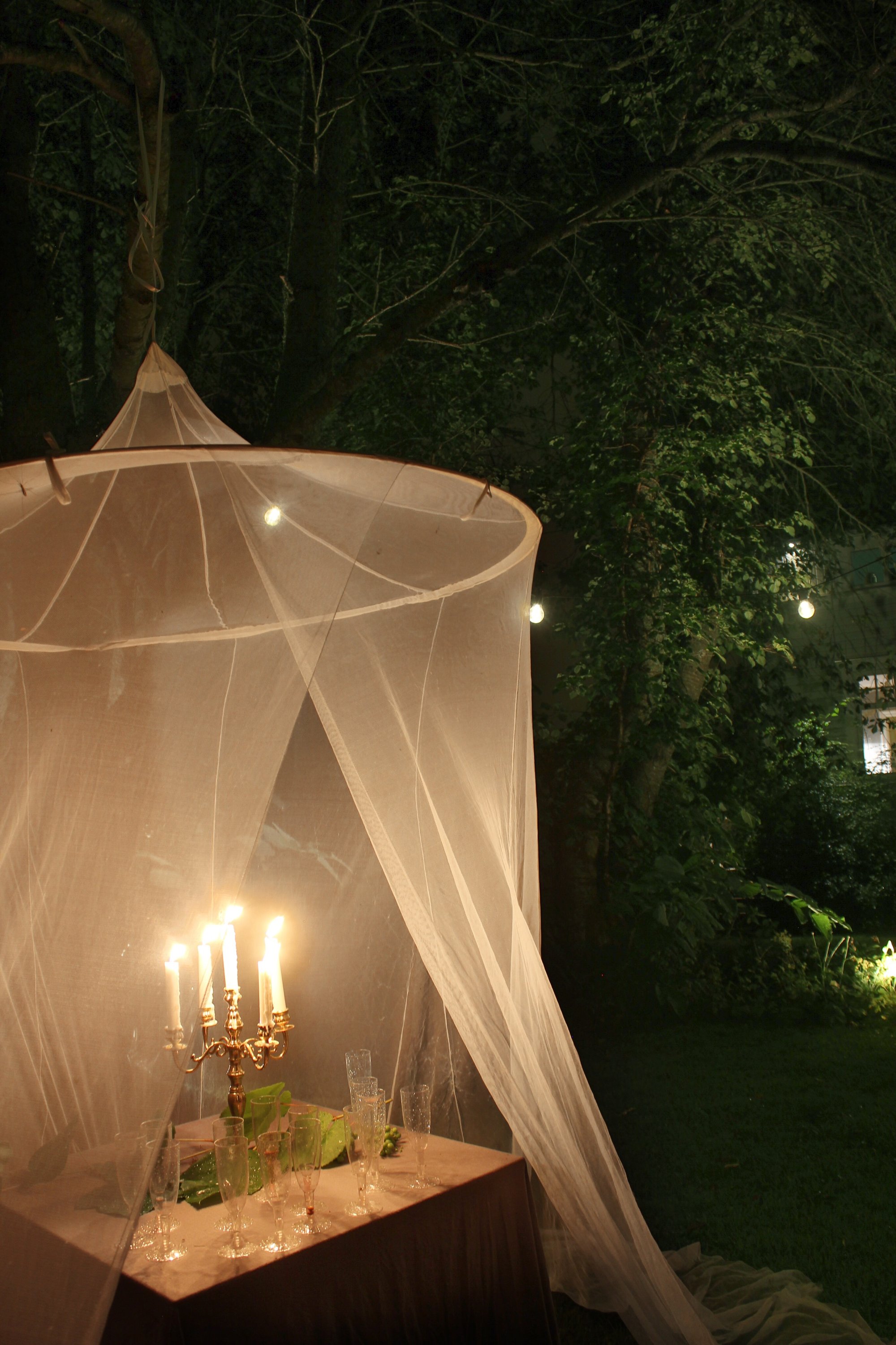 På natten när alla gäster åkt hem smög vi ut i trädgården under lyktornas sken. Stearinljusen i kandelabern brann fortfarande och de höga bigarråträden lystes upp av trädgårdsspotlights och lyktor i trädens grenar.