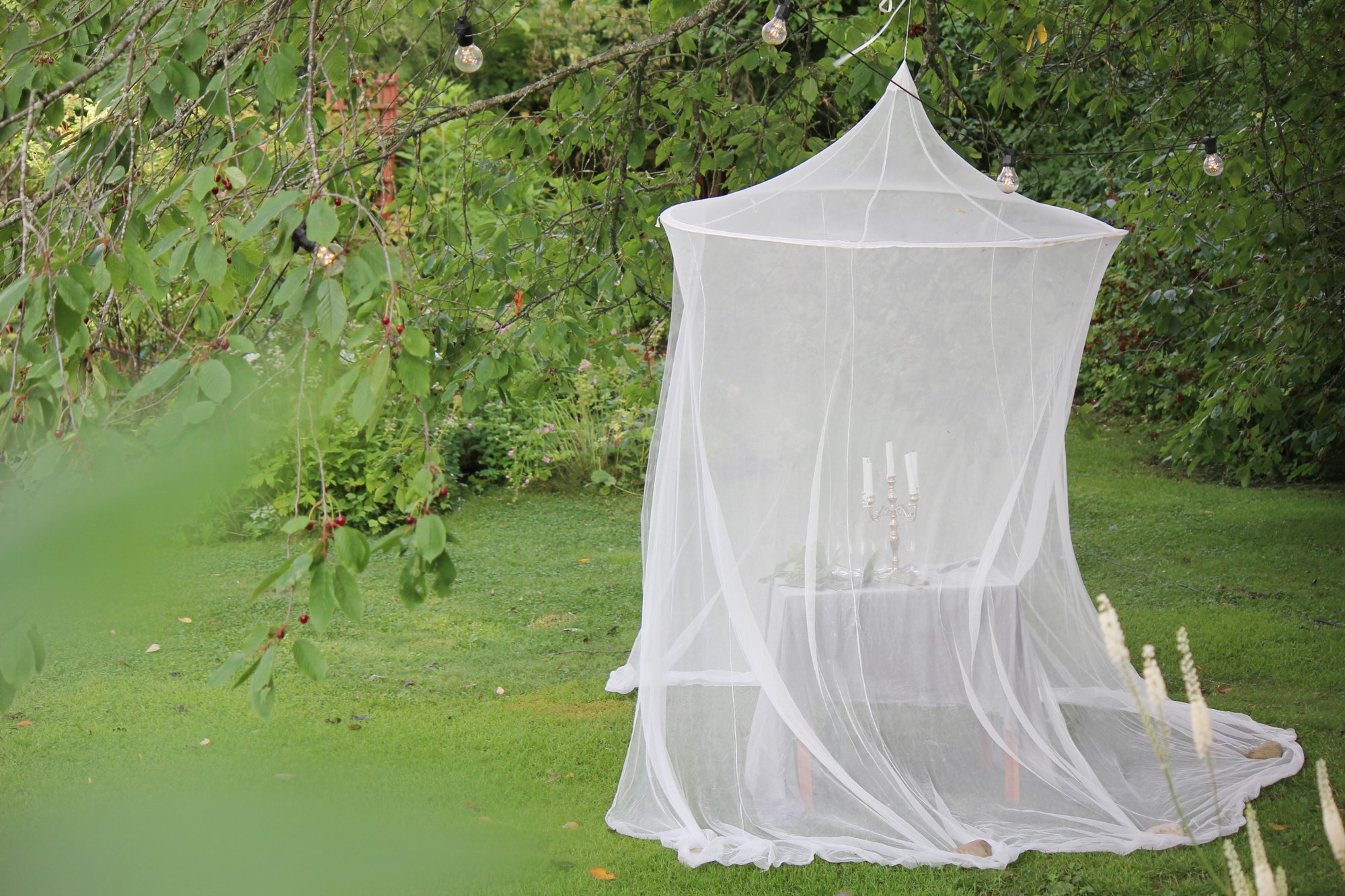 Under bigarråträden placerade vi ett nättält från Ikea (Solig) och hängde solcellslampor (glödlampor) i träden. Här ställde vi lite cider och snacks som gästerna fick när de kom till festen.