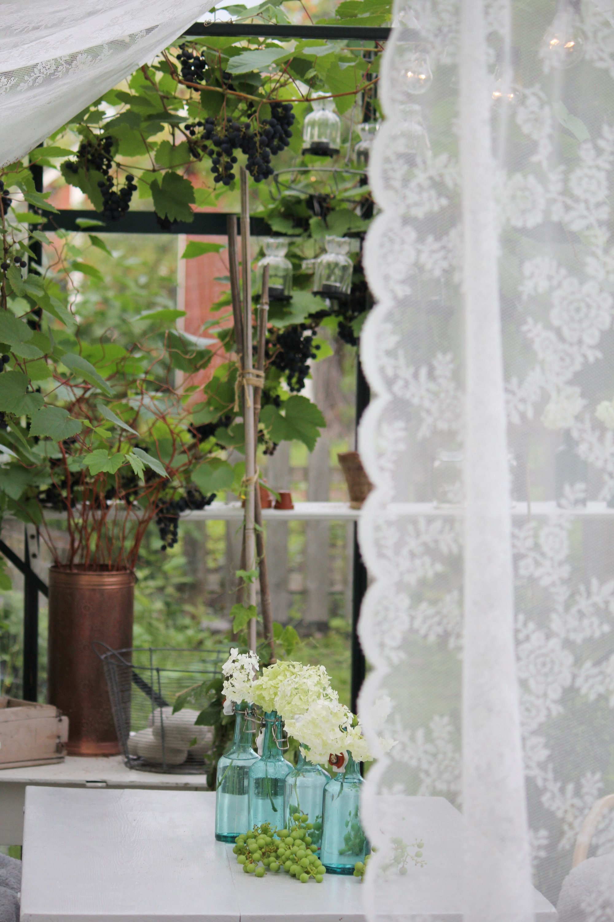 Växthuset fick bli ett annat trädgårdsrum. När sommarregnet hittade hit så var det ett gäng som satte sig där under vindruvorna medan regndropparna smattrade mot glastaket.