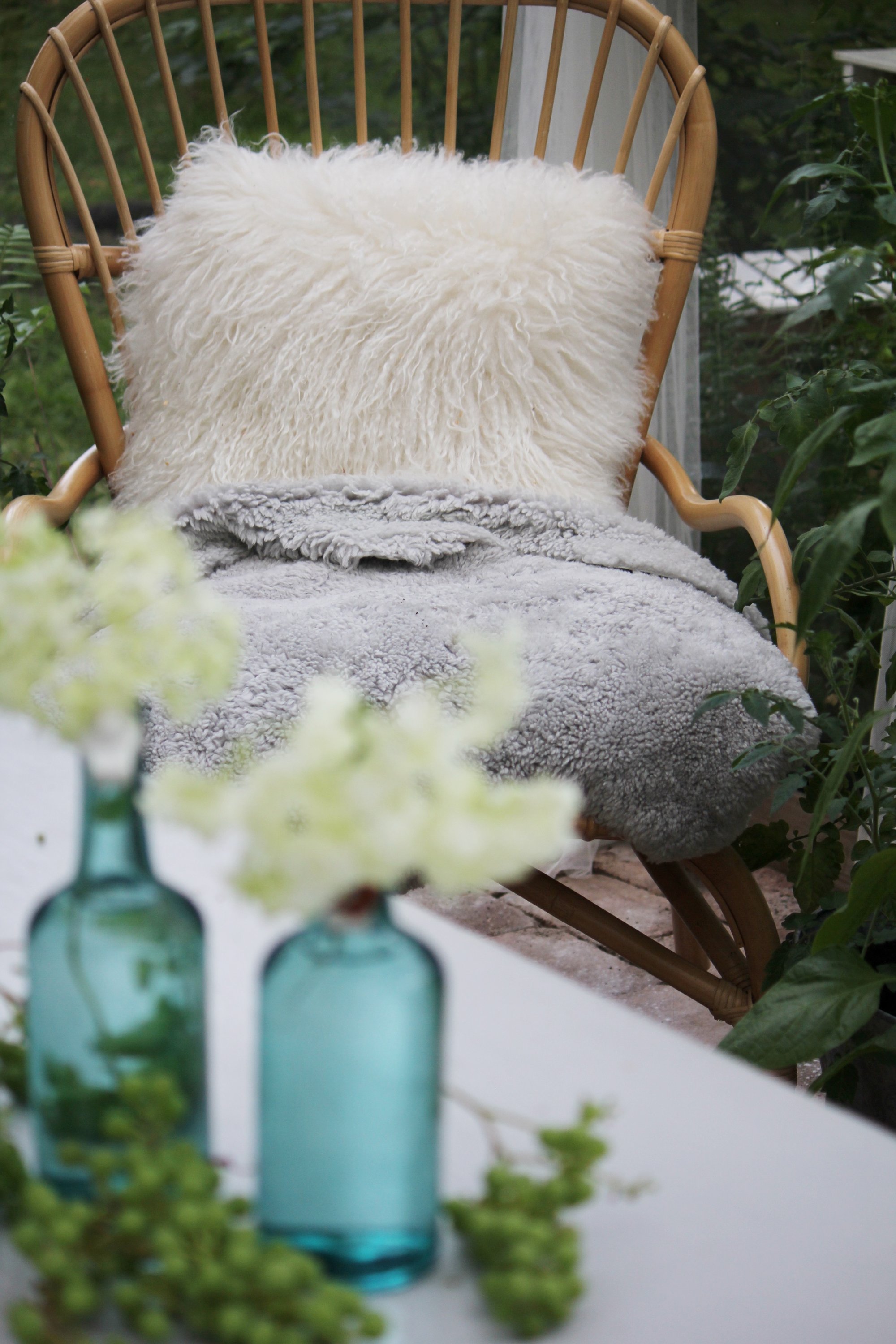 I växthuset finns en gammal kökssoffa och ett gammalt träbord, några udda trästolar och en mysig korgstol. Tycker att materialet i fotöljen skapar värme bland allt det gröna. Har passat på att lägga dit några fällar som jag tänker kan vara mysiga när Septembervindar smyger sig på.
