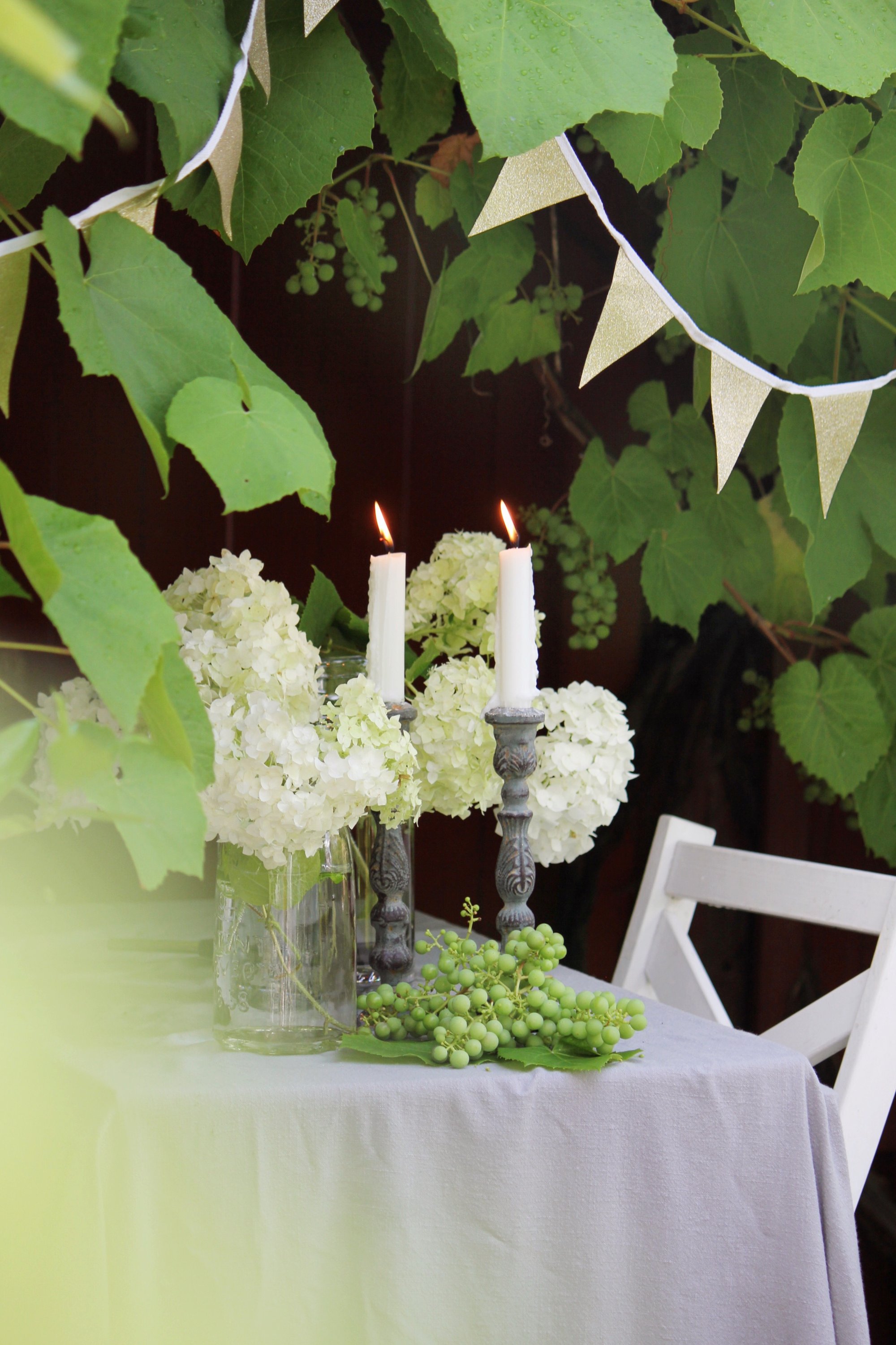 När jag dekorerar tänker jag ofta på talet tre och använder mig ofta av olika höjder. Här är det två vaser i olika höjd och istället för en tredje mindre vas så valde jag att ställa dit ljusstakar. Lite ruffiga i stilen för att bryta av mot de mjuka fluffiga blommorna. Druvornas färg fick förstärka bladverket som är själva taket och druvor blev ett genomgående tema på dukningen både inomhus och utomhus.