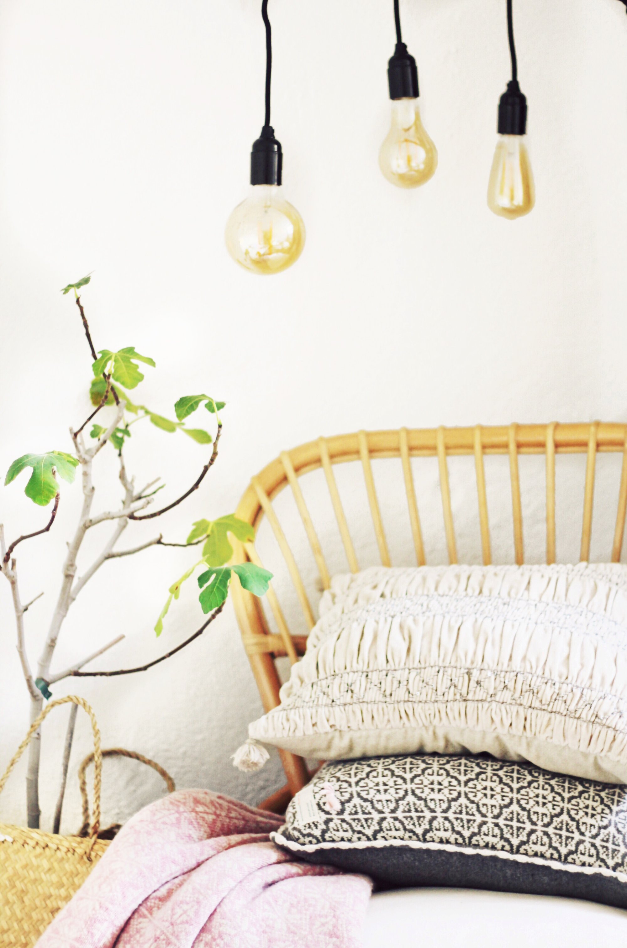 Både olivträdet och fikonträdet har vaknat till liv efter vintervilan. Så härligt med alla växter som tar fart igen! Korgstol från Åhlens, korg från rusta, kuddar och filt från Odd Molly samt pläd från julmarknaden i Högbo Bruk.