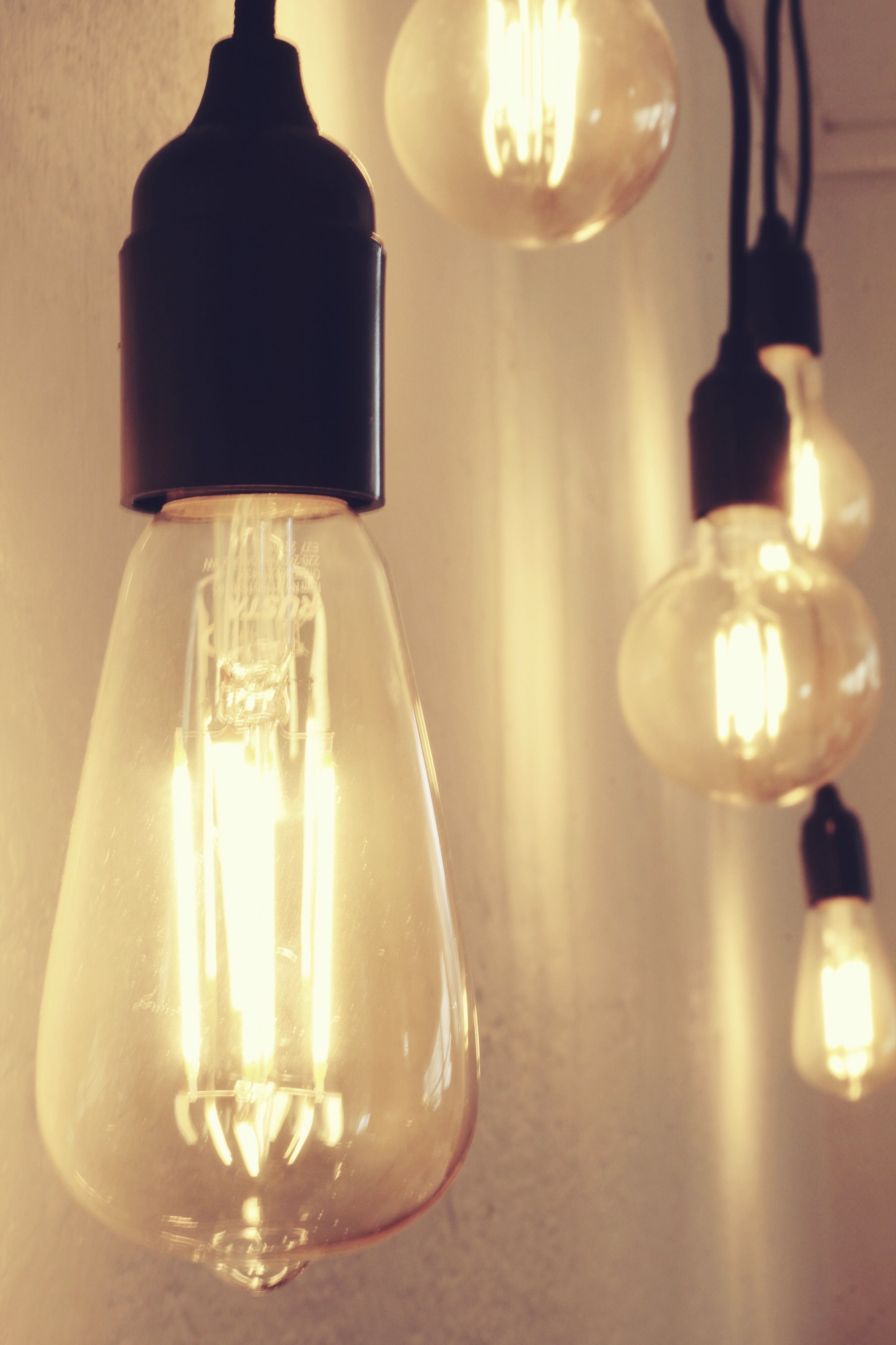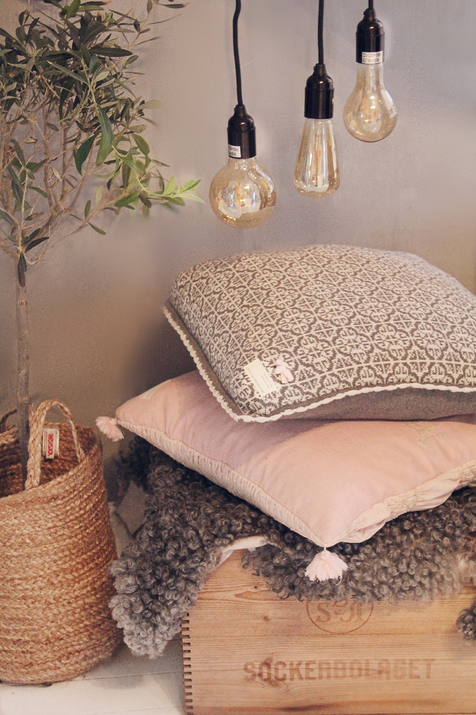 Gillar att göra små myshörn hemma. Små läshörnor eller bara ett litet myshörn som blickfång. Det blir ju så mycket mysigare med bra belysning. Jag har en hel del retroglödlampor hemma. De hänger lite här och var. På nästa bild ser ni en liten titt in i vår källare som tidigare varit skomakeri men som vi numera gjort om till ett Spa. Lamporna hänger i olika höjder mot en putsad vägg.