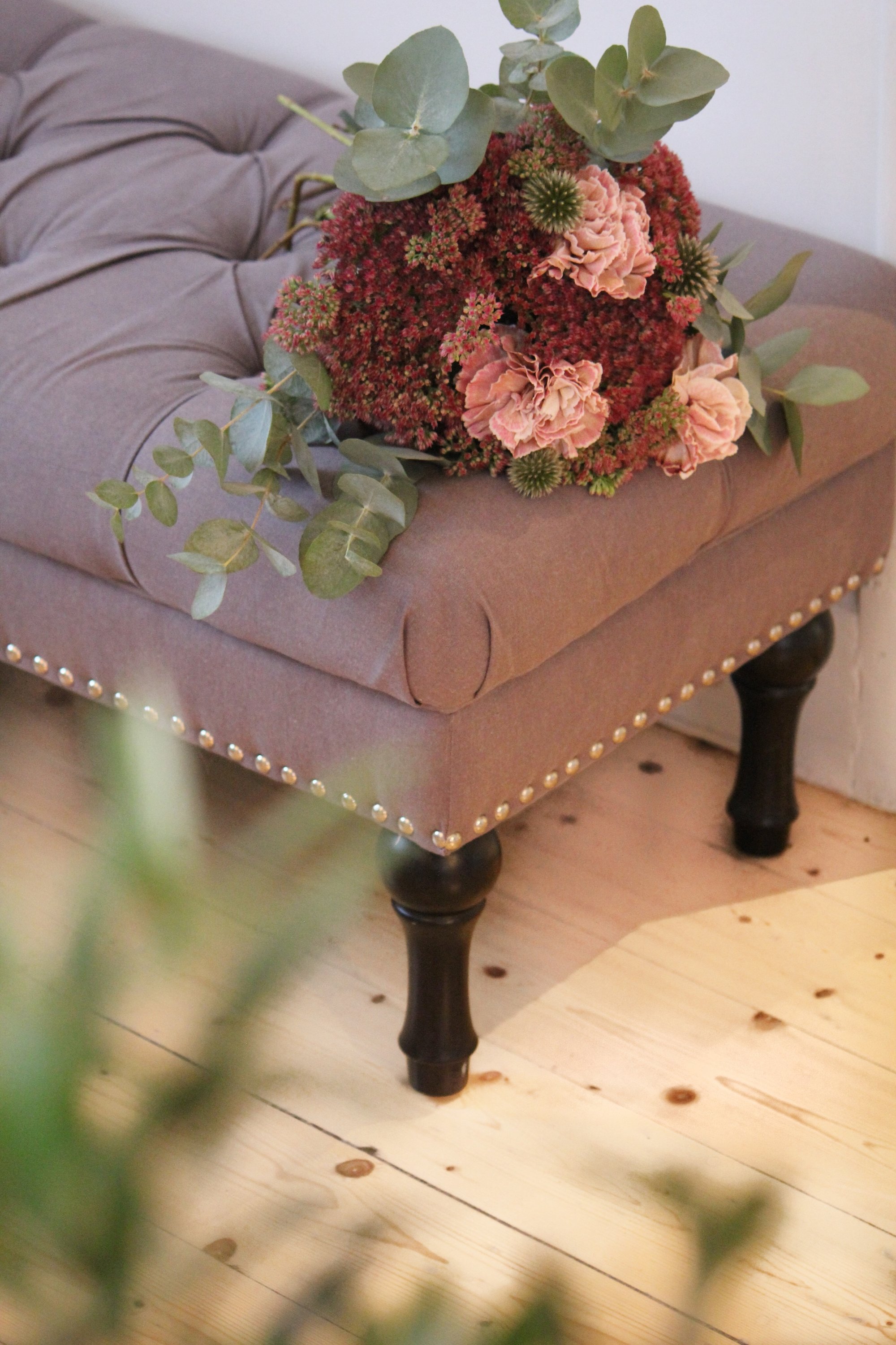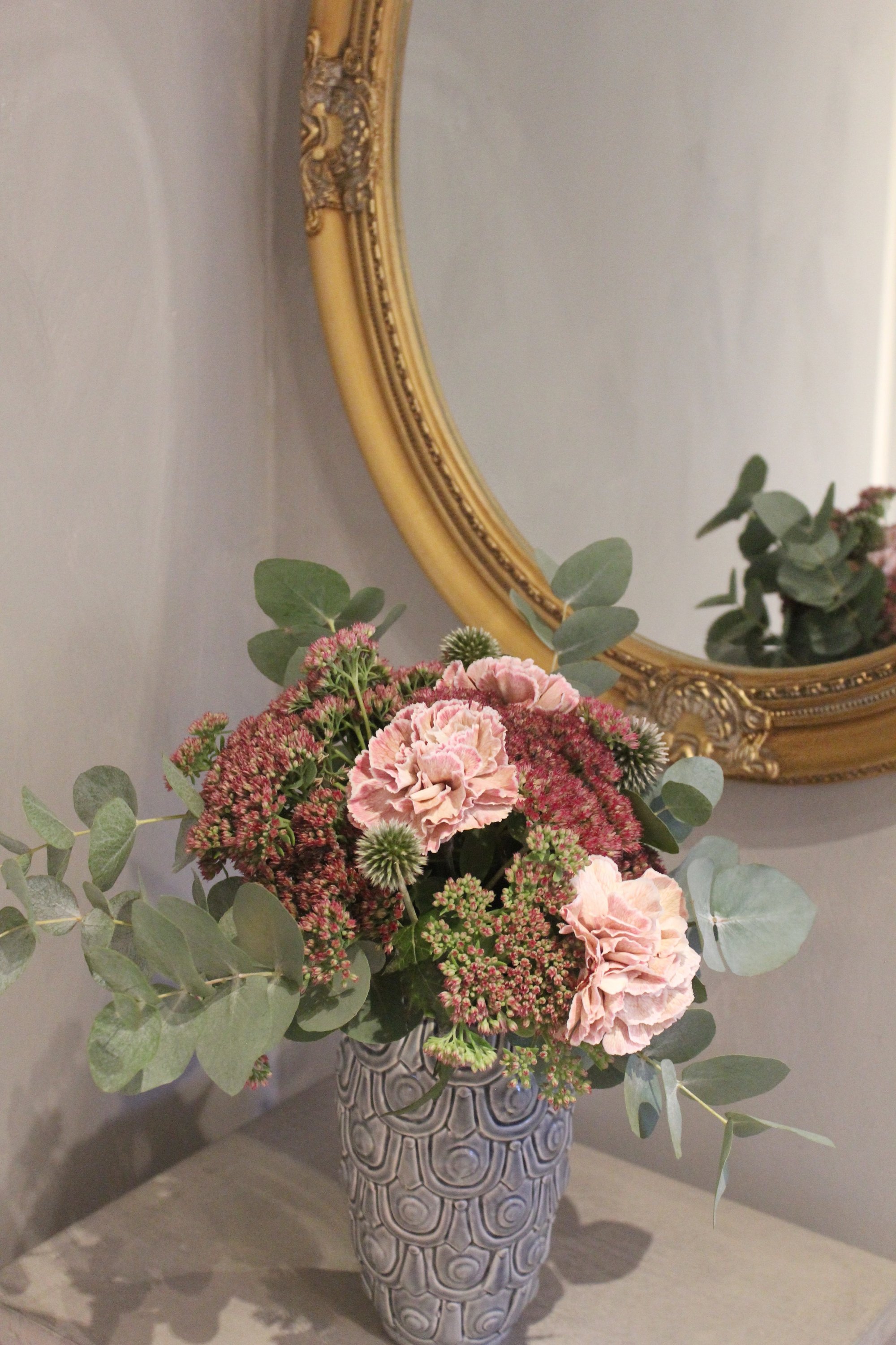 Tänkte att jag skulle visa er en fredagsbukett som jag gjort i ordning. Använde de sista blommorna från trädgården nämligen kärleksört och bolltistel (som blommat om efter att jag klippte ner den). Band buketten tillsammans med ett knippe eukalyptus samt stora puderrosa nejlikor (heter: bruna nejlikor) som nästan påminner om pioner.