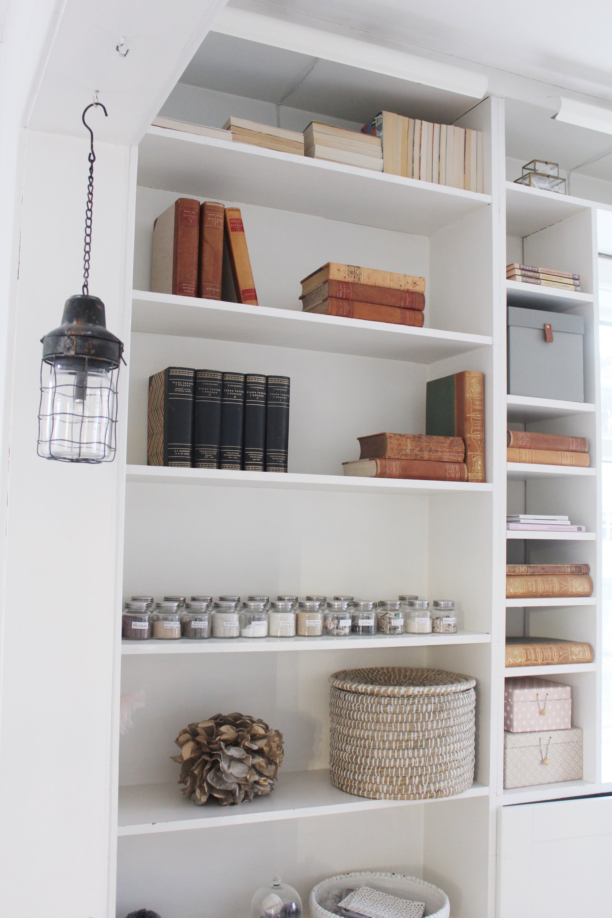 En annan rofylld aktivitet tycker jag är att få till lite lästid. Här är vår inbyggda bokhylla i vardagsrummet. Jag sparar på gamla böcker med bruna skinnryggar och guldtext. Tycker de är så fina. I bokhyllan finns även sand i glasburkar som jag samlat på våra resor.