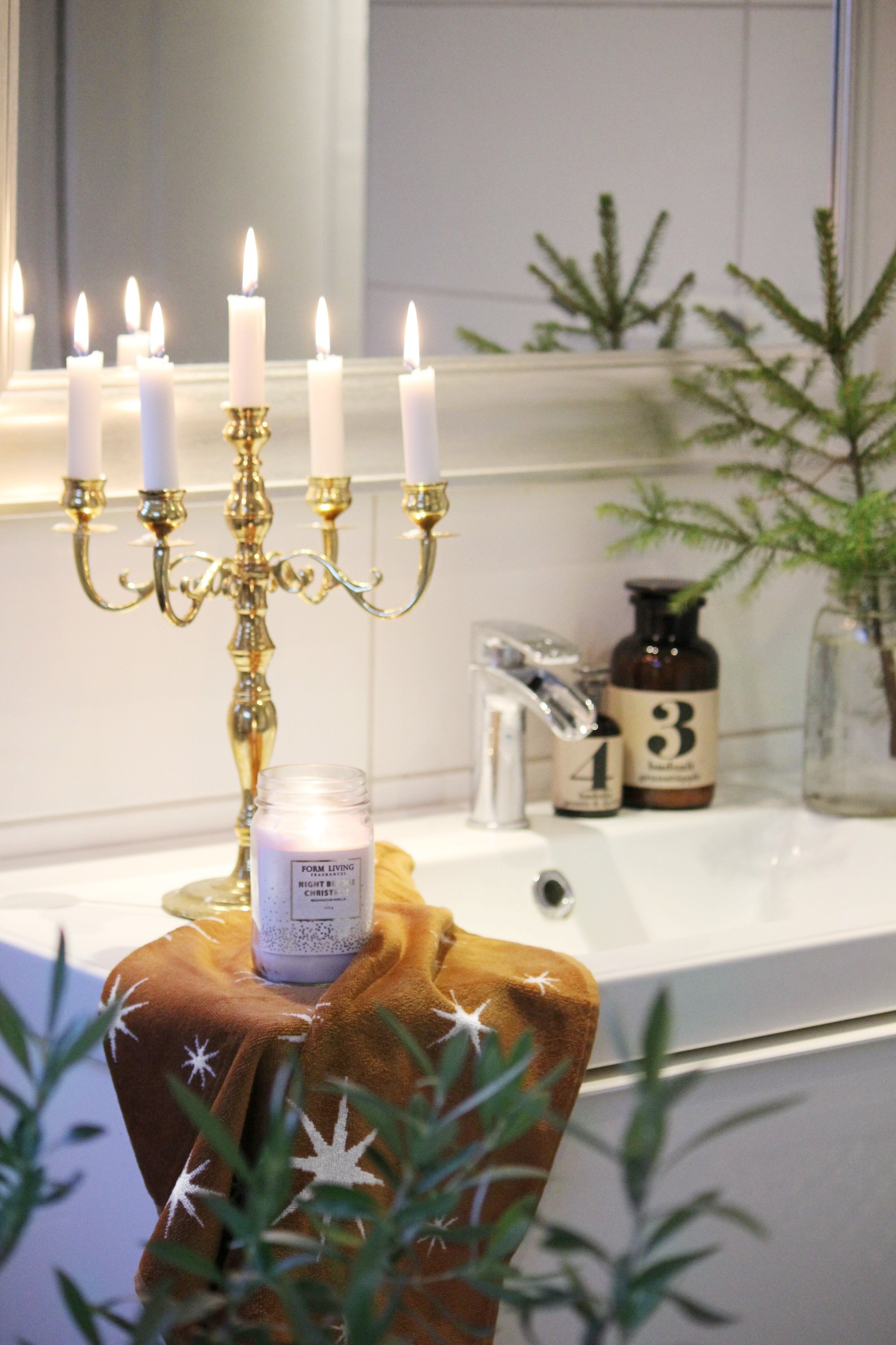 En liten minigran och juliga handdukar har flyttat in i vårt lilla källarspa. Handdukarna hittar du om du klickar här.
