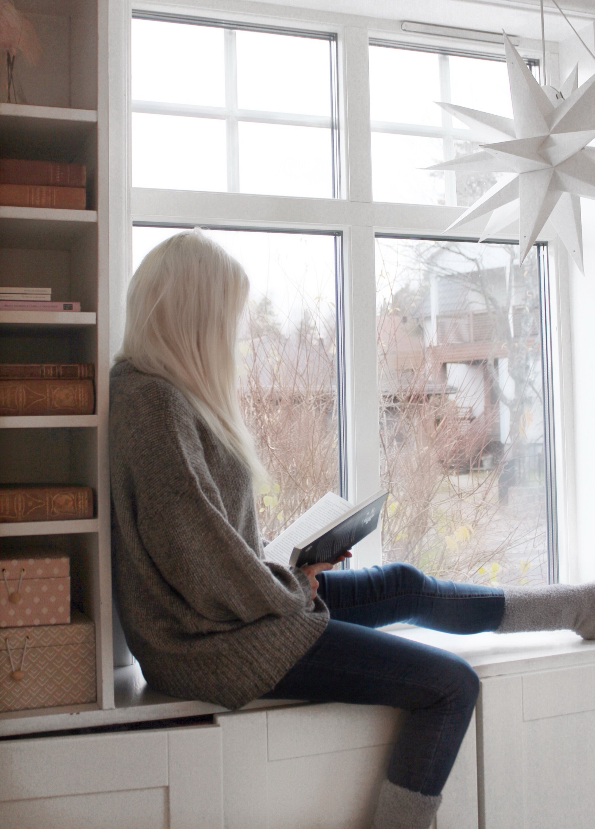 Det finns en djup fönsternisch då bokhyllan är byggd runt fönstret. Där kan man hitta sin läshörna!