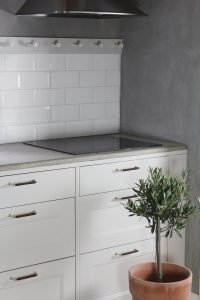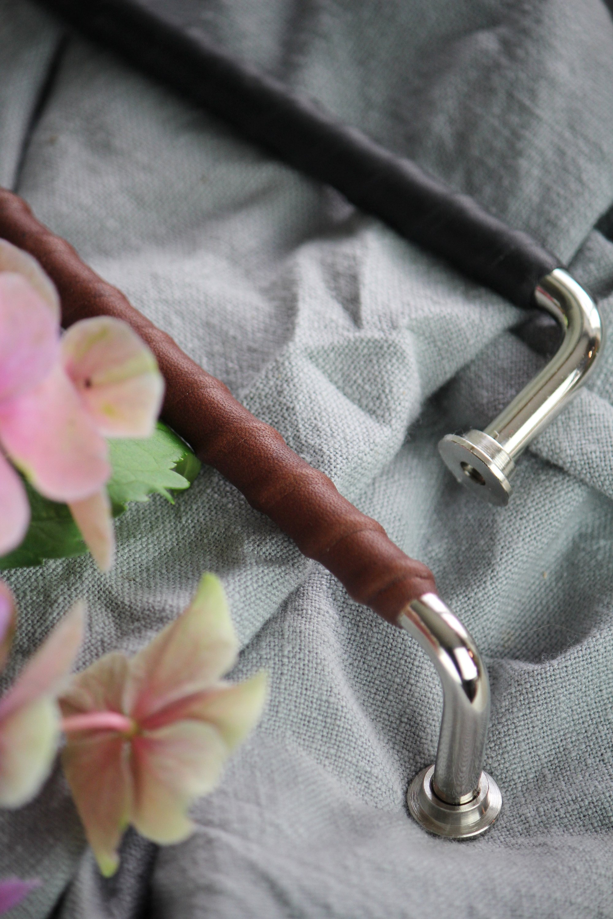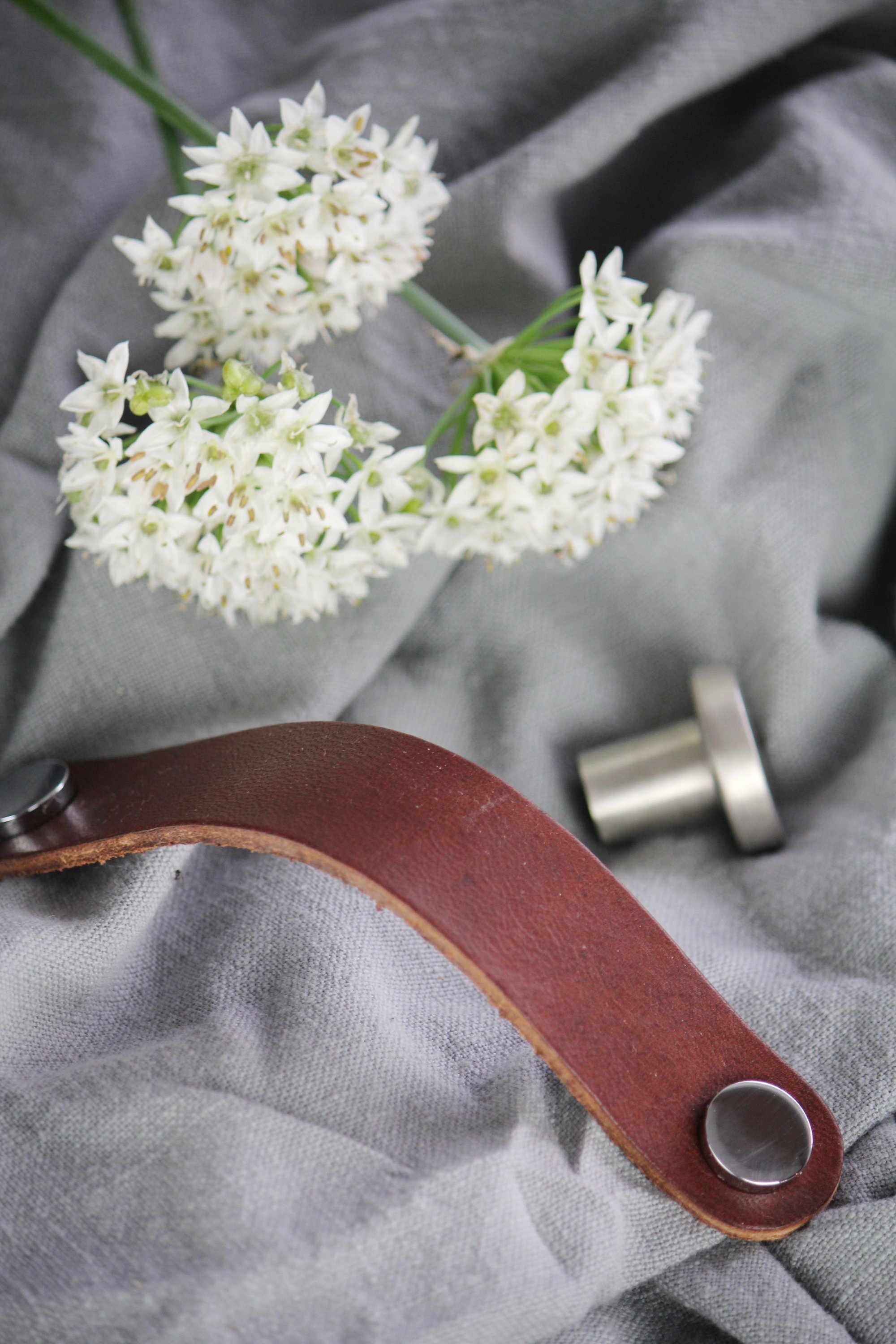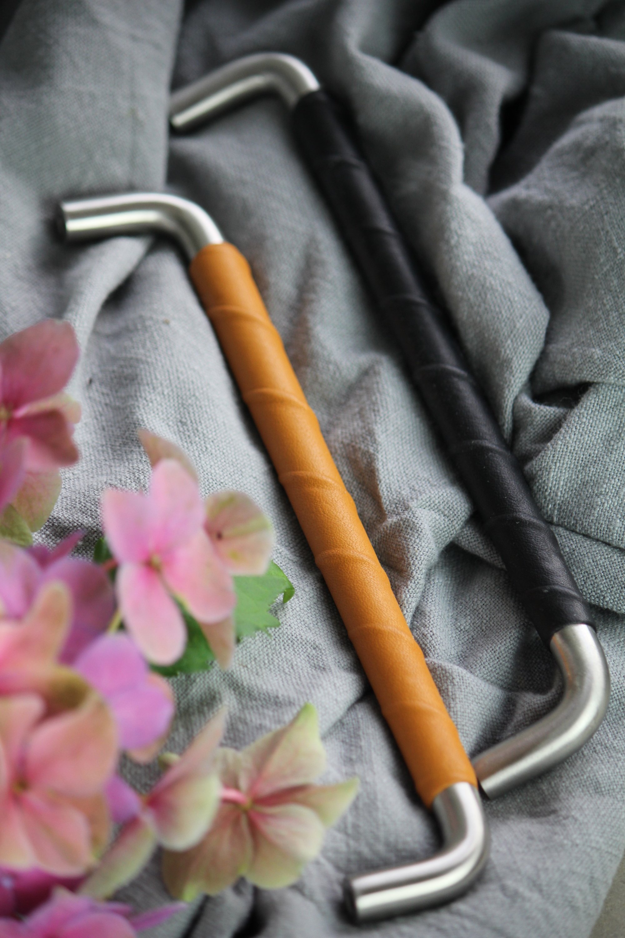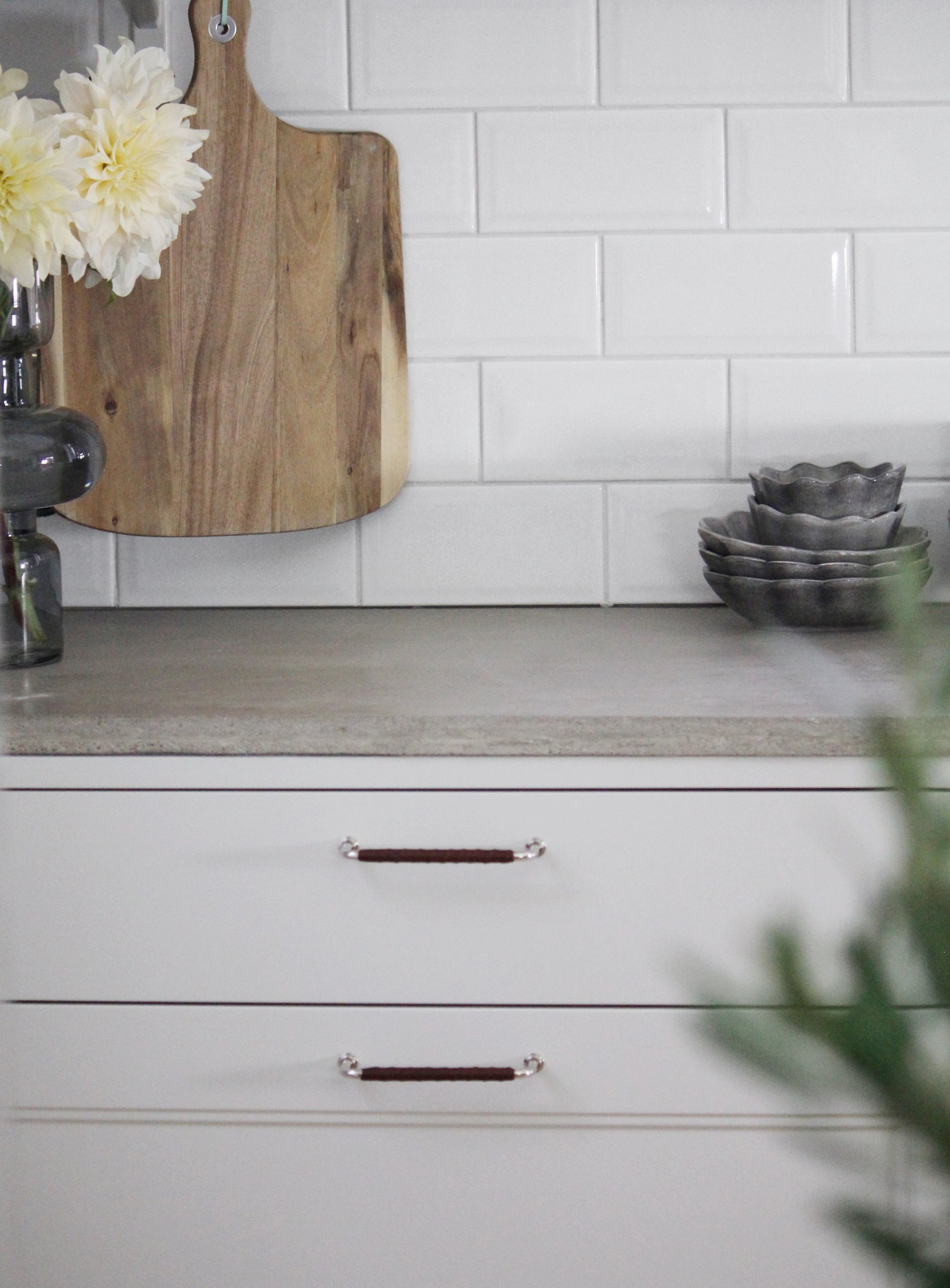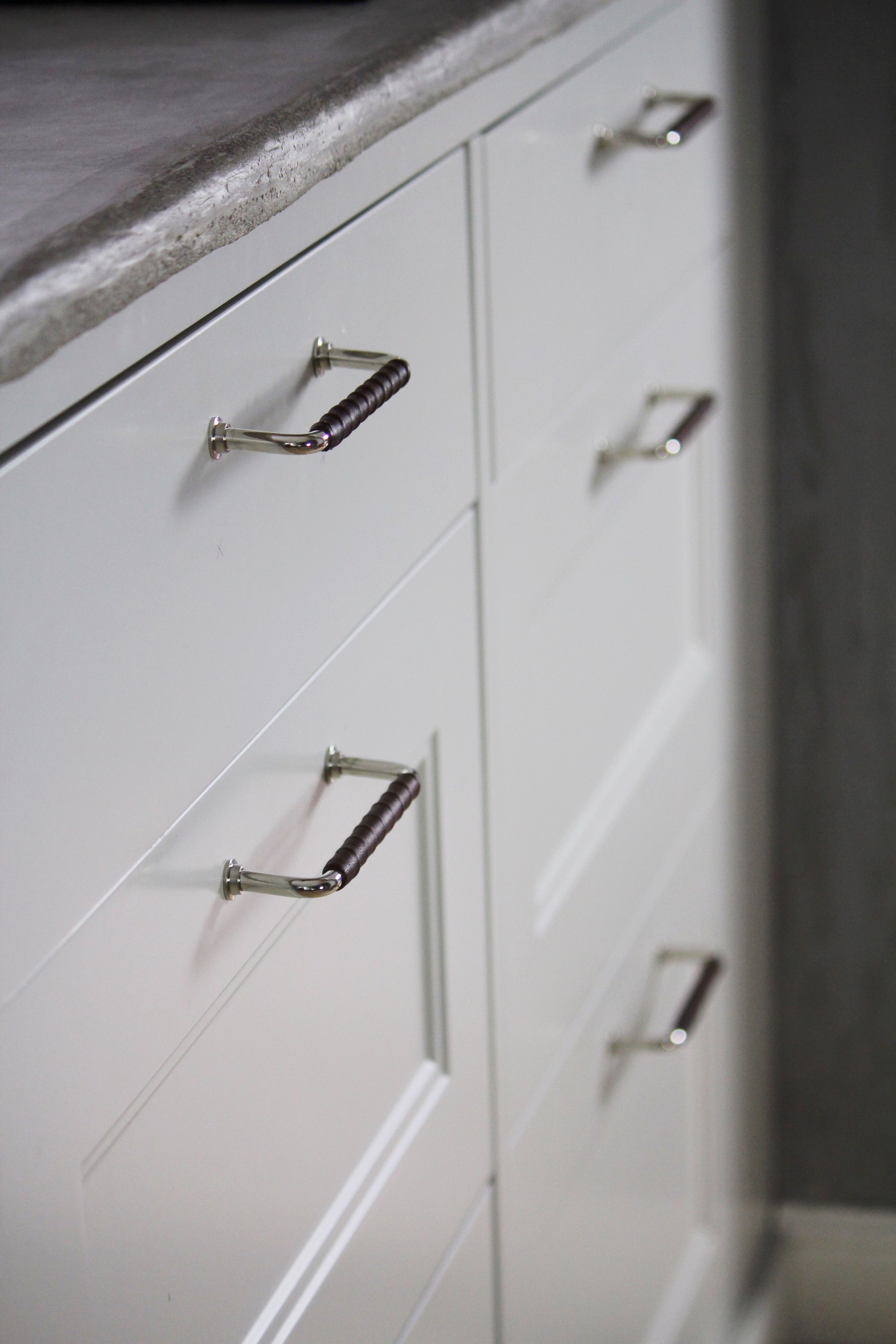 En tidlös design och vi gillar läderdetaljerna. De känns rejäla och sköna i handen och blir bara finare och finare med tiden då läder har den förmågan. Valde det mörkbruna handtaget för att få in lite värme till de ljusgrå luckorna.