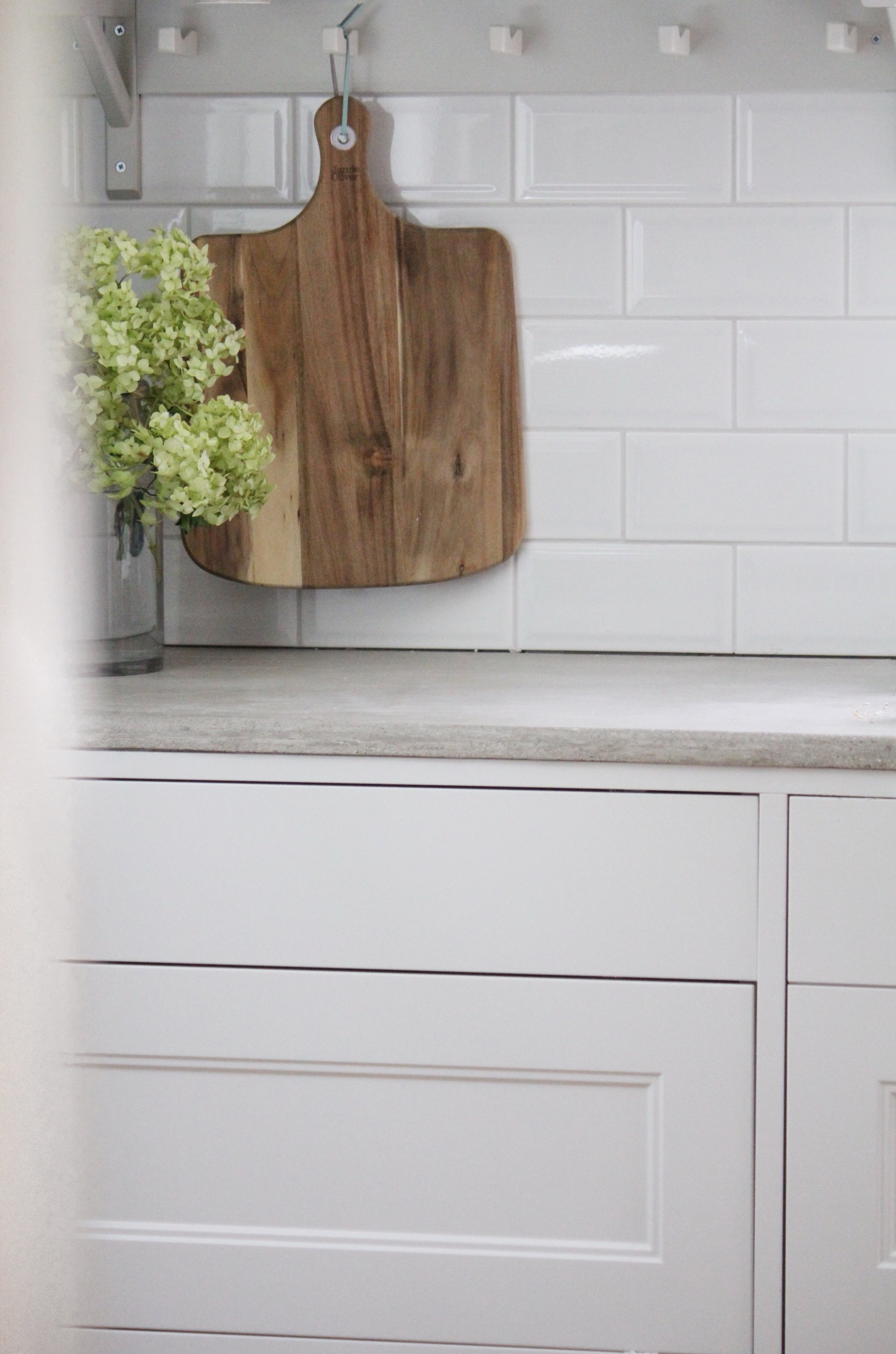 Köket är ljusgrått och vi har valt att ha en av väggarna med endast kökslådor. Bänkskivan har vi gjutit själva i betong. Byggt en form och gjort uttag för spis och diskho. Vi ville att köket skulle se platsbyggt ut för att passa in i stilen på huset som är från 1928. Därför har vi valt att ha distanser mellan lådorna. Kaklet är fasat. Jag hittade en vägg med ljust dessa plattor på Gysinge Byggnadsvård och tyckte att de skulle passa in i stilen. Ovanför kaklet sitter en knopplist. Skärbrädan är från Jamie Oliver-serien och den limegröna hortensian är från vår trädgård.