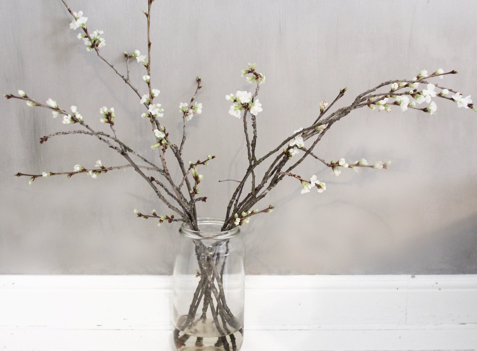 Jag älskar körsbärsblommor eller i vårt fall är det biggaråblommor. Vi har en dunge med biggaråträd på gården som är riktigt gamla och högre än själva huset. Från Februari ungefär brukar jag plocka in kvistar och låta dem blomma i omgångar. Det blir så vårigt och fint tycker jag. Det tar ca 2 veckor från det jag knipsar av dem och sätter dem i vatten tills det blommar men det kan vara lite olika. De man köper i blomsteraffären där det redan är gröna kroppar brukar slå ut på på ca en vecka. Prova gärna med äppelkvistar, syren eller något annat vårigt. Om du inte har tillgång till trädgård så finns en hel del kvistar i blomsteraffärerna nu. Hur härligt är det inte med t.ex. en Magnoliakvist.