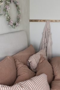 Sängramen har jag gjort själv. En gammal sängram som jag klädde in med en linneduk. Kransarna ändrar jag lite efter årstid och knopplisten går längs med hela väggen. Tröjan är från Åhléns.