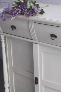 Fick veta att farfar Curt hade möbler från den gamla sommarstugan som rivits. Möblerna skulle inte användas mer då de var slitna och färgen lossnat på flera ställen. Ni förstår säkert vad som hände sedan. Möblerna flyttade till min stora glädje hem till oss. Vi har två vackra gamla bord från stugan som används flitigt och det här fina skåpet ska få nytt liv och ny färg. Lådorna har svällt och går inte att öppna så det blir nästa projekt. Nu står den nere i vårt källarspa och väntar på att jag ska börja fixa med den. Tänker att den ska få bli förvaring till handdukar m.m. och ska målas i en grå nyans.