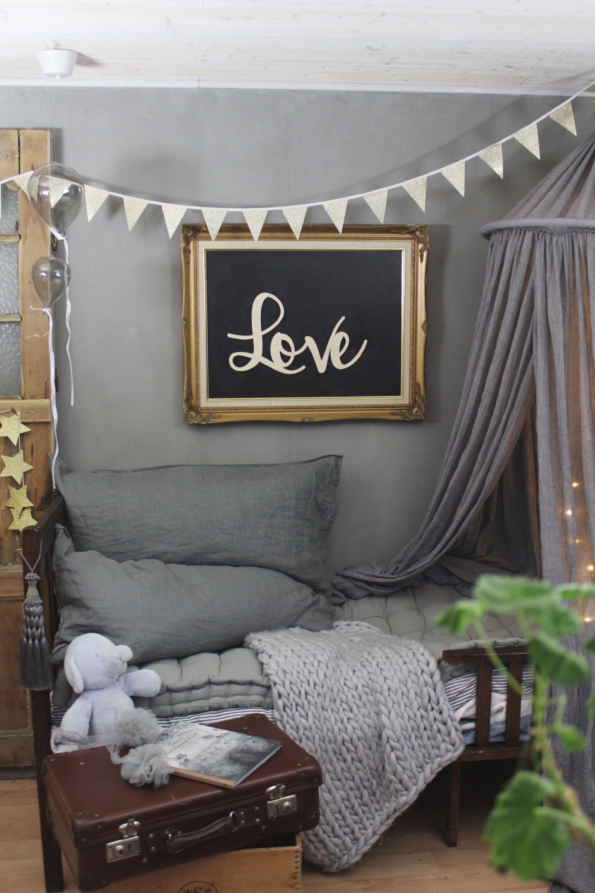 Tänkte visa er ett samarbete som jag fotat i vårt uthus. En del av uthuset är ett litet barnrum som finns där när de minsta kommer på besök. Loves namn fick stå på skylten som är gjord av trä och är så fin tycker jag. Här står den på kroklisten jag visat tidigare men den går ju även bra att ha på väggen. Kanske ovanför sängen eller på dörren till rummet.