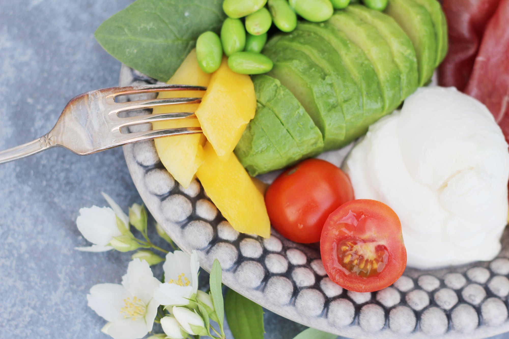 Avokado, bladspenat, små tomater, mozarella, gröna soyabönor (köper dem frysta och tinar dem lite bara i hett vatten) och mango (ÄLSKAR!). Erik har gärna breasola eller serranoskinka till och kanske lite keso i en burk vid sidan av. Surdegsbaguette och något gott kallt att dricka till!