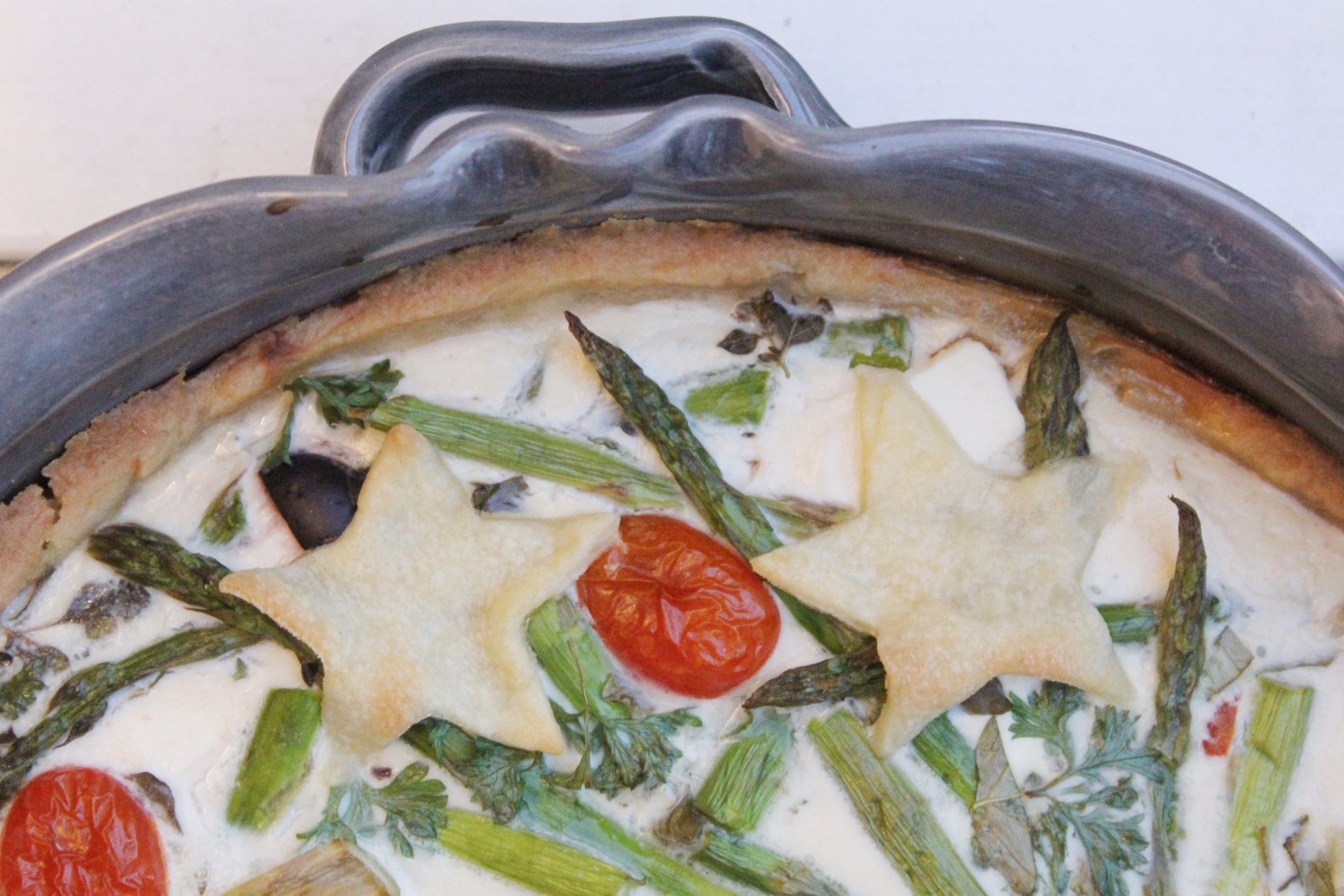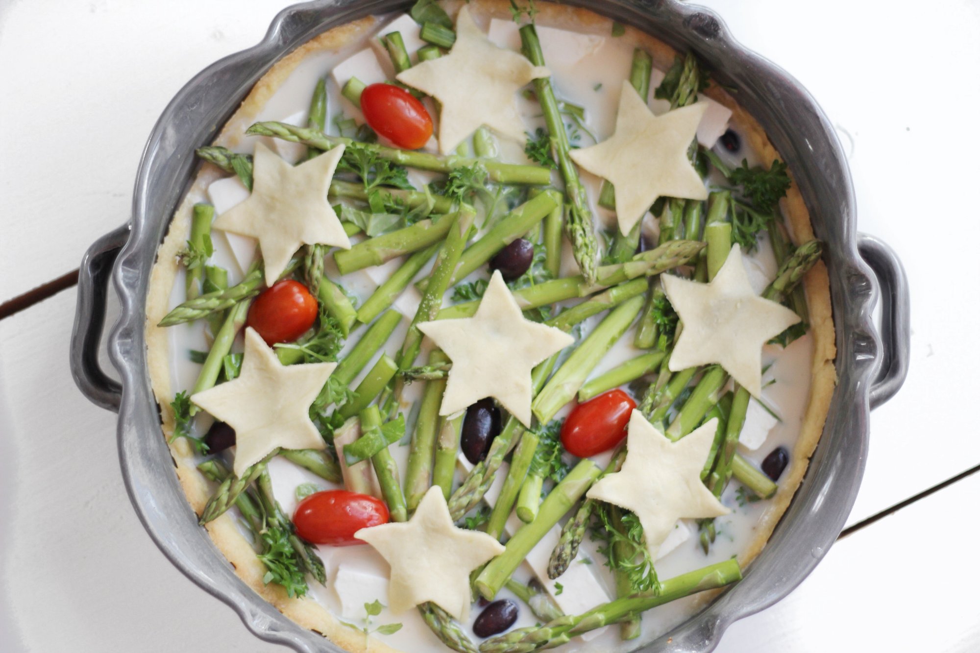 Över fyllningen häller du på 3 ägg och 3 dl mjölk som vispats ihop lite lätt med en gaffel. Överst lägger du t.ex. tunna stjärnor av degen (kavla ut tunt på bakplåtspapper och ta ut stjärnor med hjälp av pepparkaksformar). Du kan även göra andra mönster.