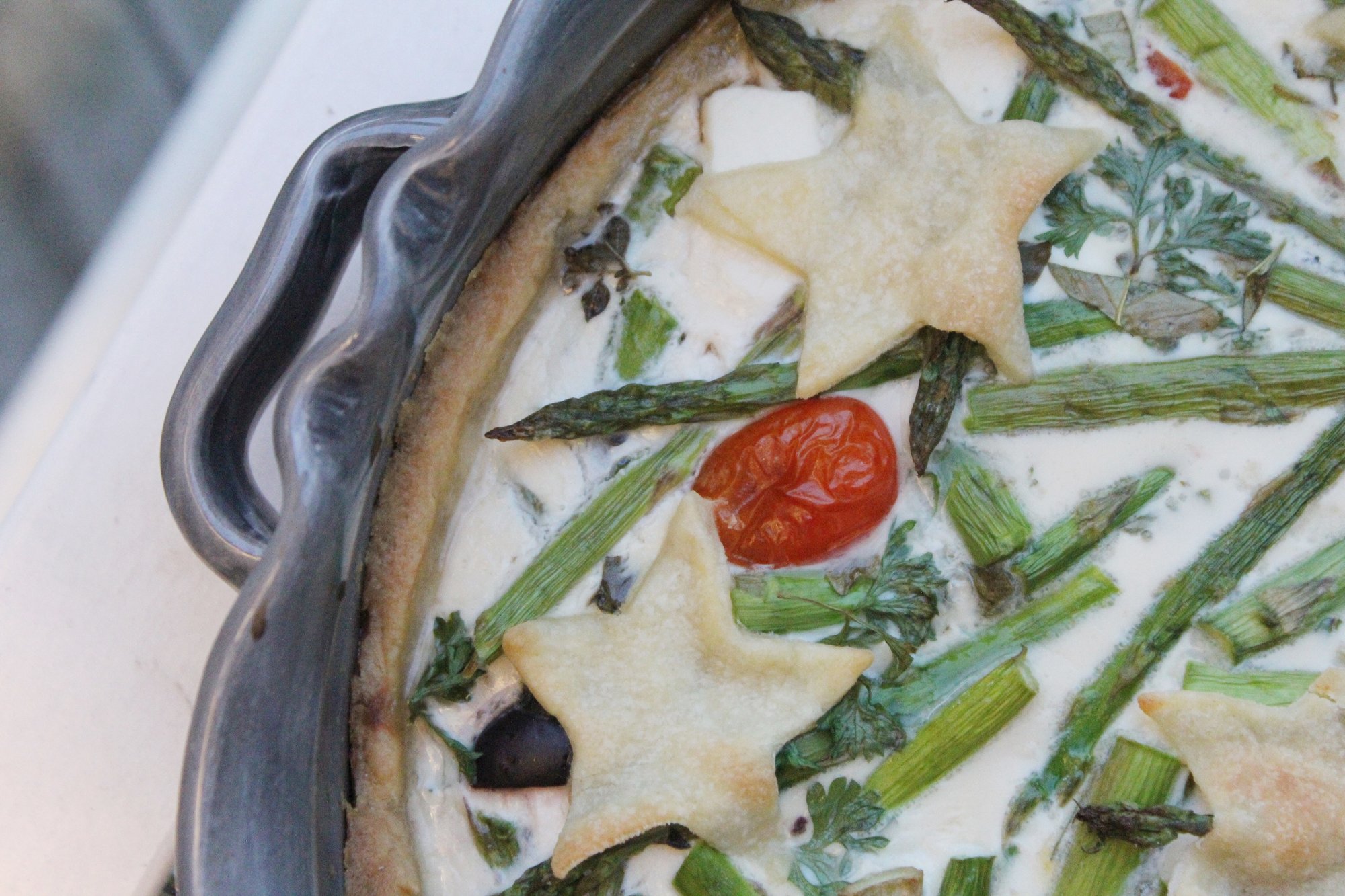 Små halva plommontomater med lite salt på, några hackade soltorkade tomater, 1 pressad vitlöksklyfta, 1 förpackning fetaost (175g), 10 svarta oliver, 1 dl hackad färsk persilja, hackad färsk oregano eller andra färska kryddor som t.ex. timjan, dragon eller salvia, ett knippe med grön sparris.