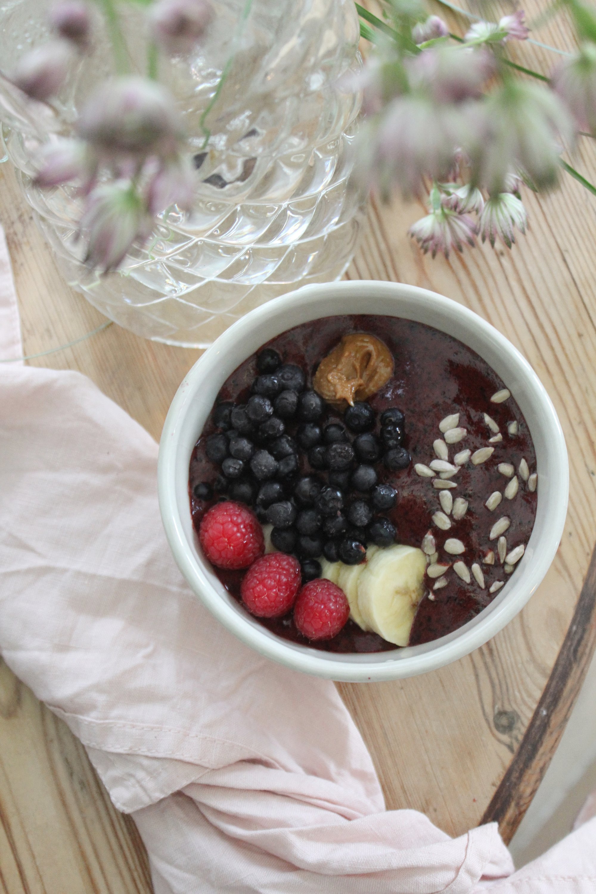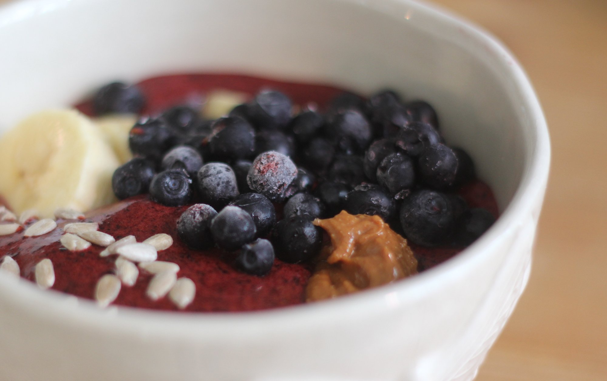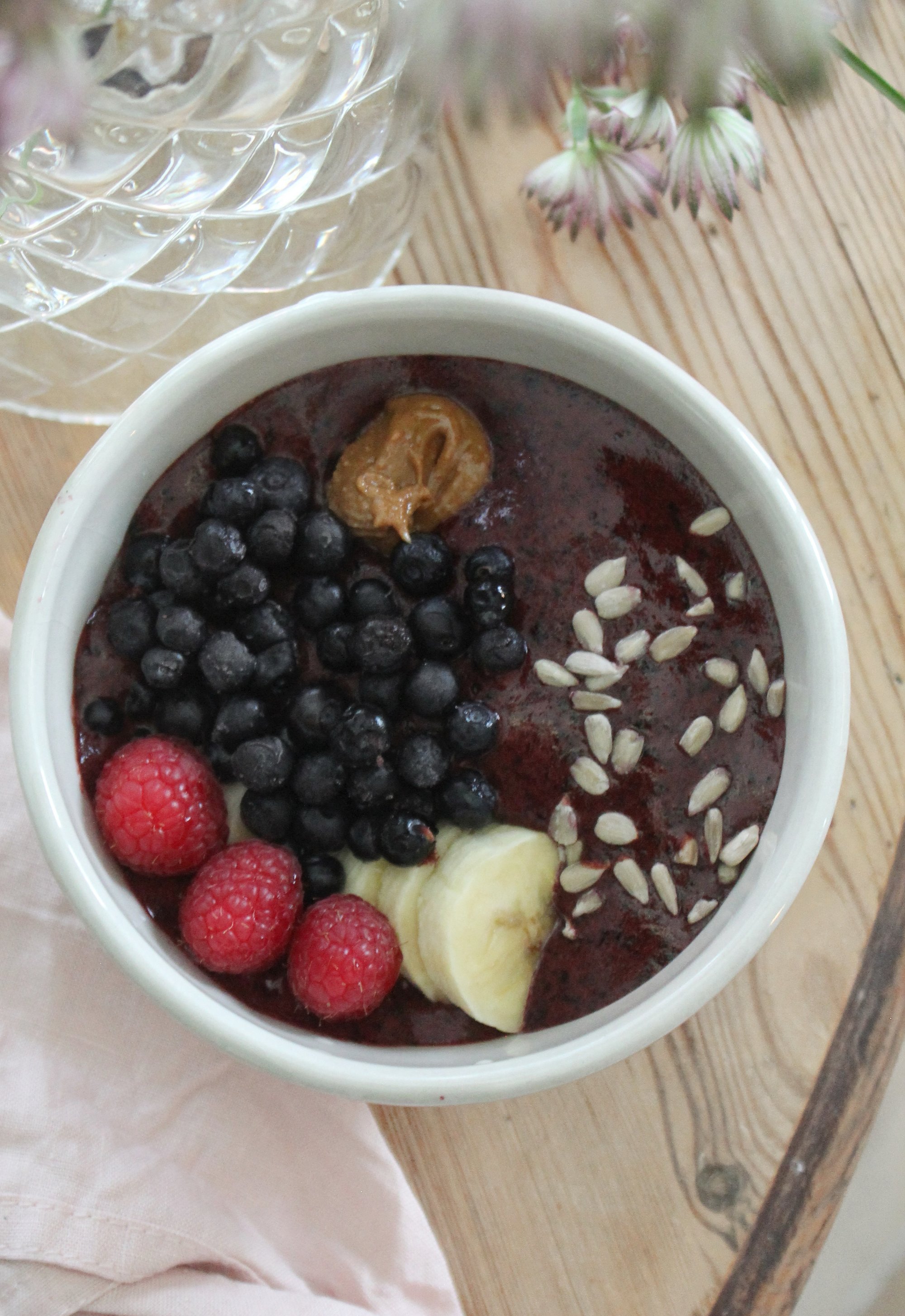 Här kommer ett tips på en riktig vitamin och antioxidantbomb nämligen min goda och krämiga blåbärsmix med en topping av banan, hallon, blåbär, solrosfrön och osötat ekologiskt jordnötssmör. Vegansk då den är utan mejeriprodukter. Självklart kan man ha vilken topping man vill. Varför inte ha nötter, mandlar, kokos m.m. Fryser man blåbärsmixen så får man en nyttig och god sorbet! Ni som känner mig vet att jag älskar sådant som går snabbt och enkelt. Här kommer receptet på detta nyttiga mellanmål eller varför inte till frukost.