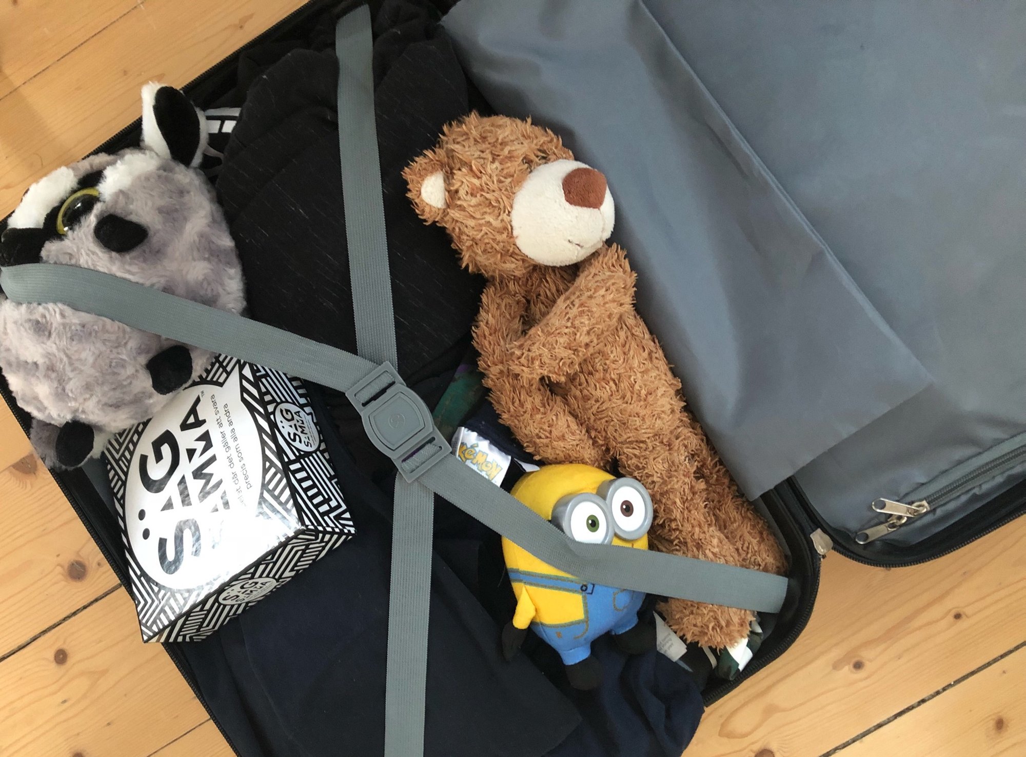 Love packade sin väska helt själv. Ni ser ju vad som var viktigast att ta med  och säkerhetsbälten skulle de ha 😀!