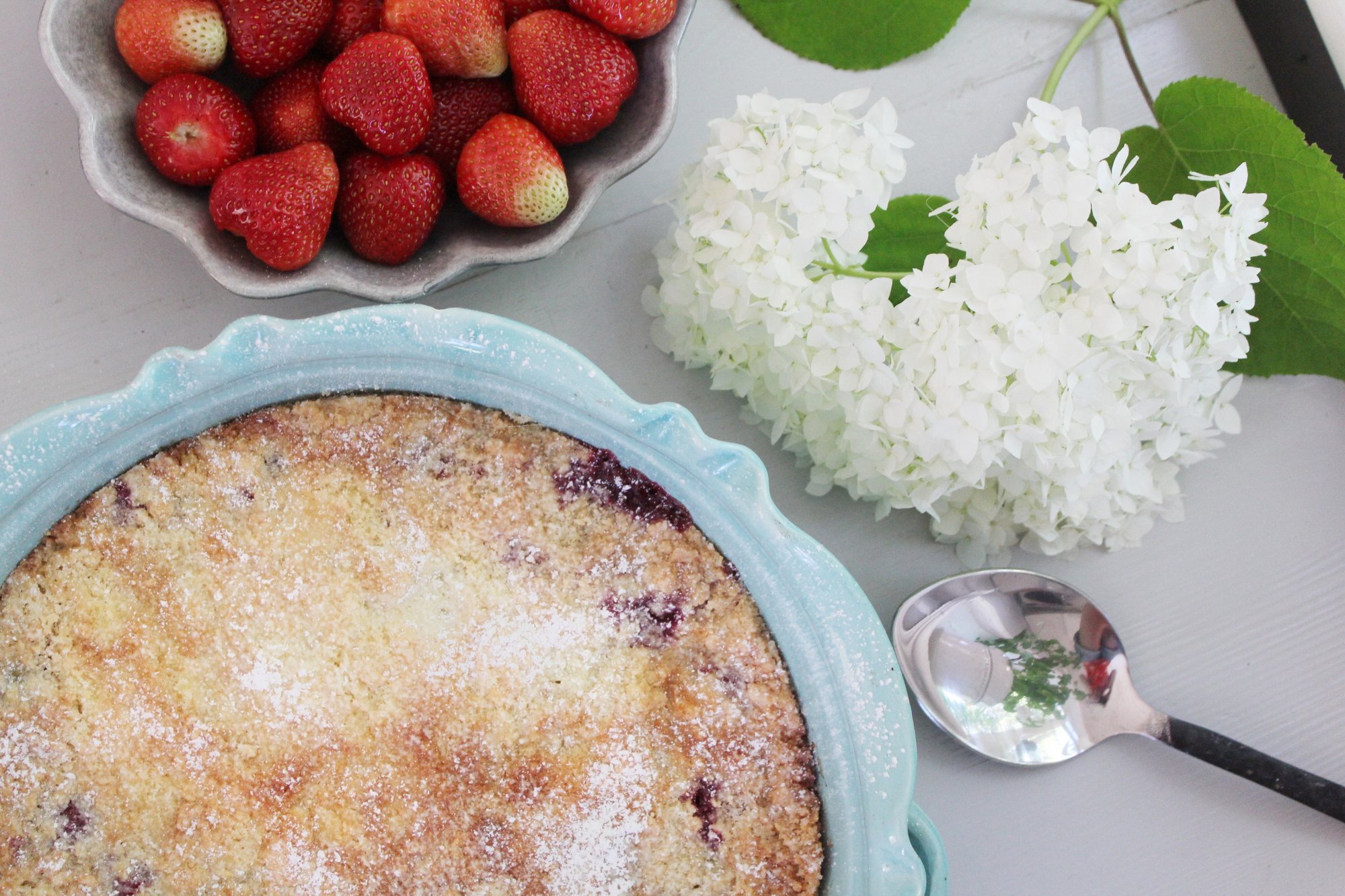 Tänk att värmen är kvar. Idag har jag fotat Dahlia, simmat i sjön och ordnat med kräftskiva! Här kommer efterrätten som vi tänkte ha ikväll. Än är det inte för sent med rabarberpajer. Mina rabarber har växt upp igen för tredje gången nu och är lagom stora att använda. Jätteenkel att göra och jättegod. Hallon hade jag i frysen. Blomman är från min vita Hortensia som fortfarande blommar och som har blommat sedan innan vi åkte till Öland.