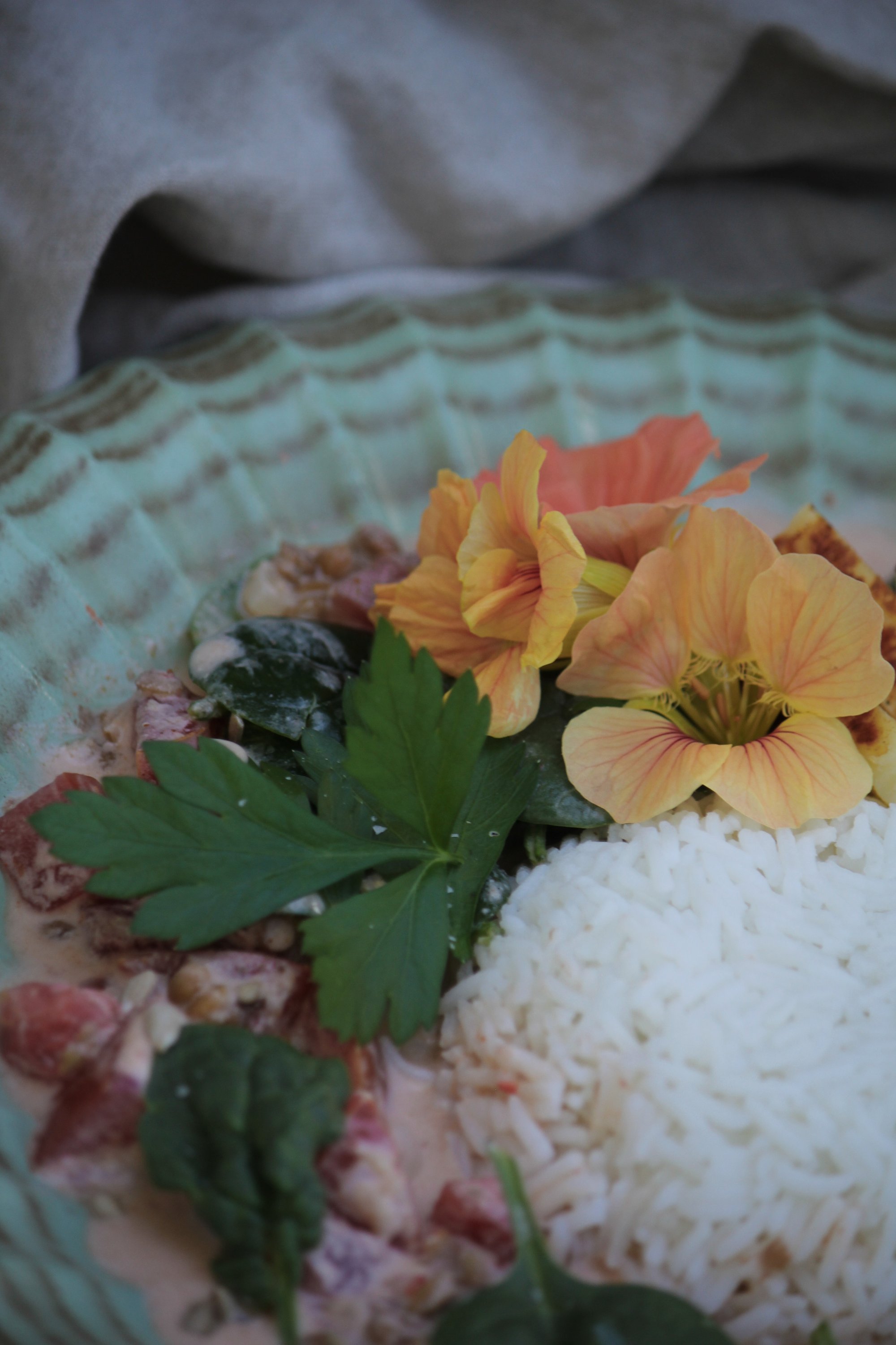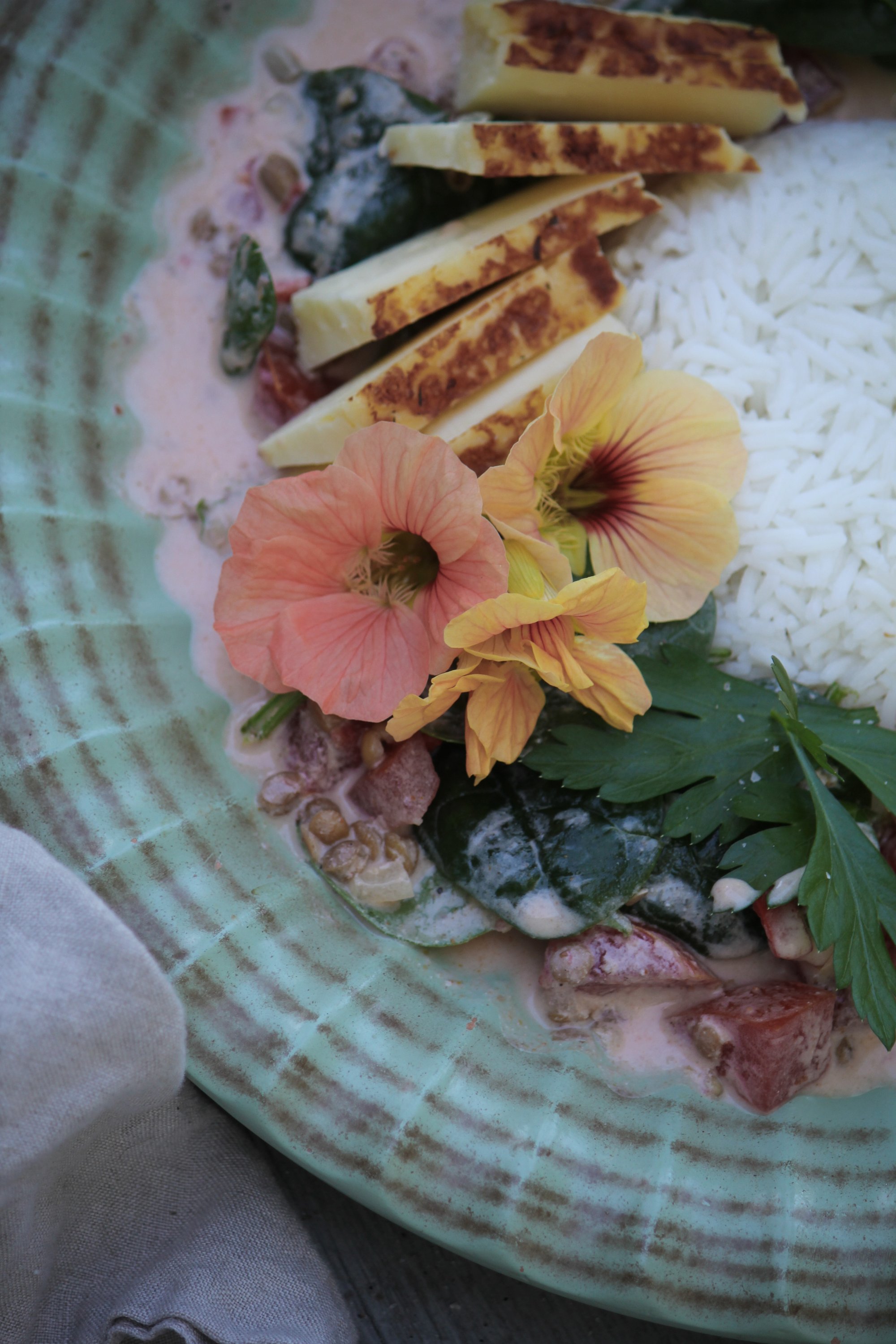 Nu ska ni få ett riktigt gott vegetariskt recept av mig. Augusti är här och det passar bra att ta vara på tomat, spenat och persilja från trädgården. Tillsammans med kokosmjölk, linser och Indiska kryddor blir det här en riktig favorit. Toppas med grillost och vacker blomsterkrasse. En enkel gryta att bjuda på till hösten också tänker jag!