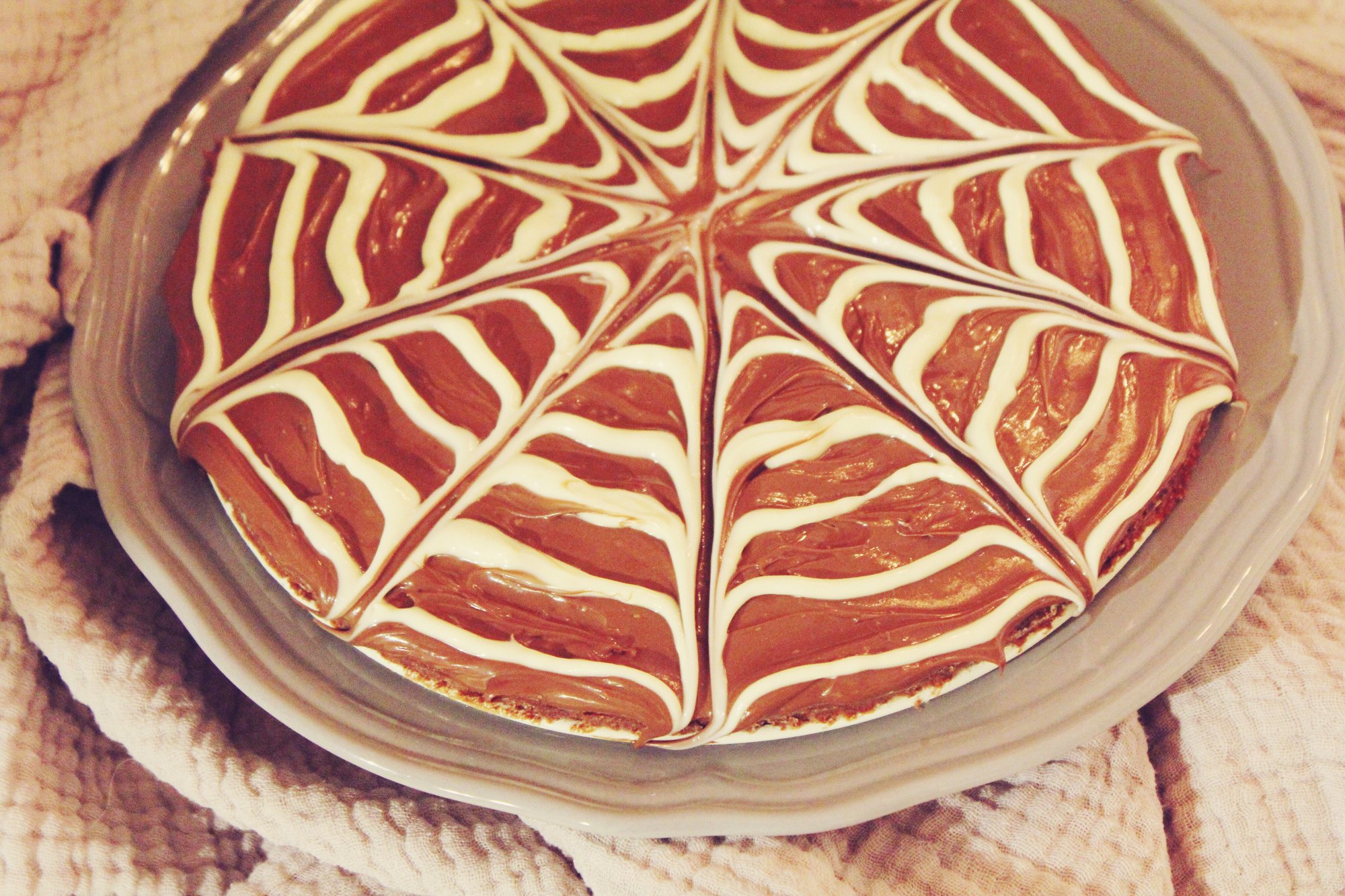 Gör så här: Sätt ugnen på 160°C. Smöra och bröa (med vanligt mjöl) en form med löstagbara kanter. Smält 100 gram smör. Vispa försiktigt ihop ägg och strösocker. Tillsätt det smälta smöret, vetemjöl, kakao, vaniljsocker och salt. Rör ihop till en smet. Häll smeten i formen och grädda kakan mitt i ugnen i ca. 20 minuter. Låt kakan svalna. Smält chokladen – den mörka för sig och den vita för sig. Bred på choklad över kakan eller bred på nutella på kakan. Nutella behöver inte smältas eller värmas. Använd sprits och gör cirklar med den vita chokladen. Utifrån och in. Stor cirkel ytterst och sedan mindre och mindre cirklar. Drag med en tandpetare eller smal pinne från mitten och ut till kanten runt om kakan så att spindelnät skapas.