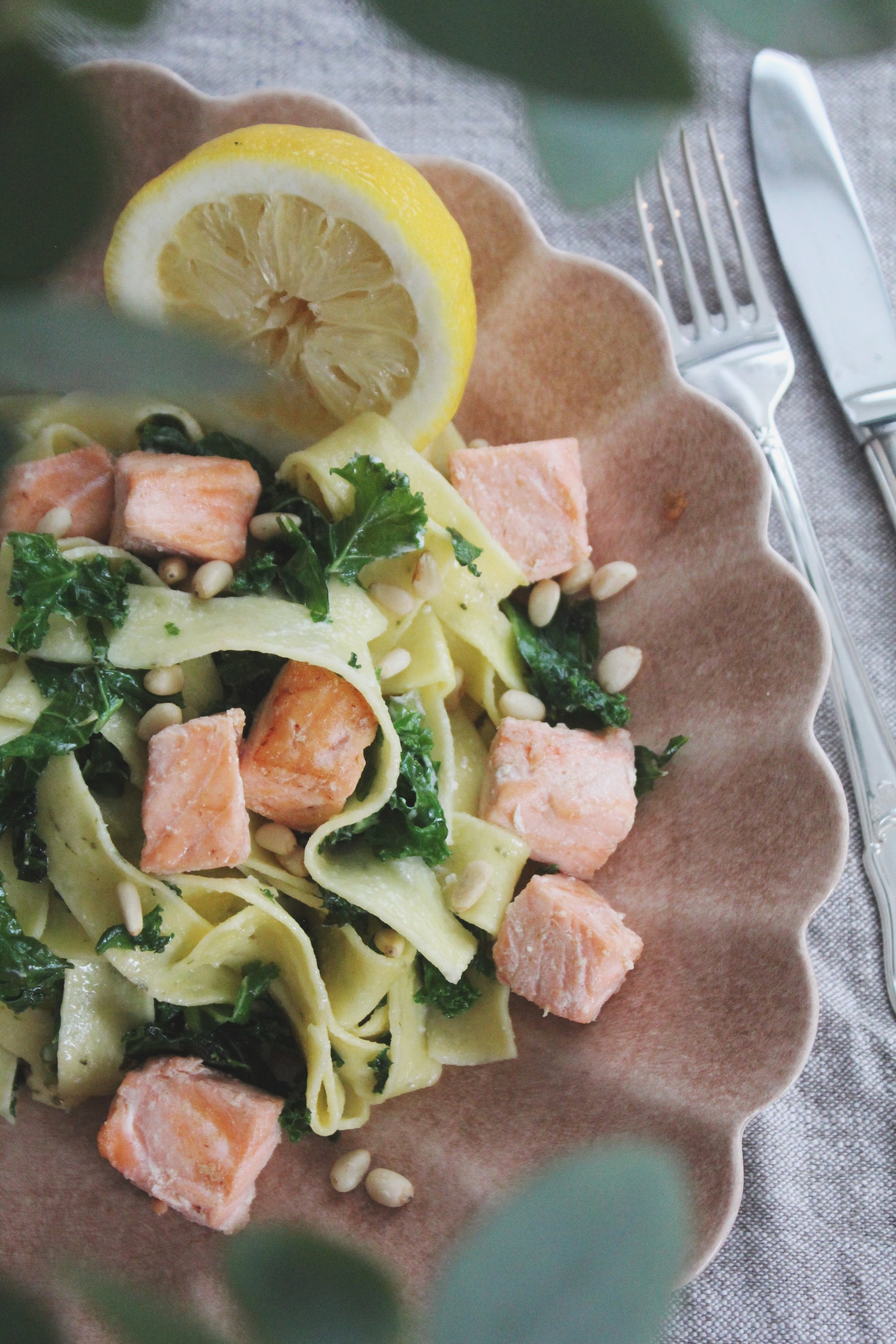 6. Toppa med laxen, pinjenötter samt parmesanost.