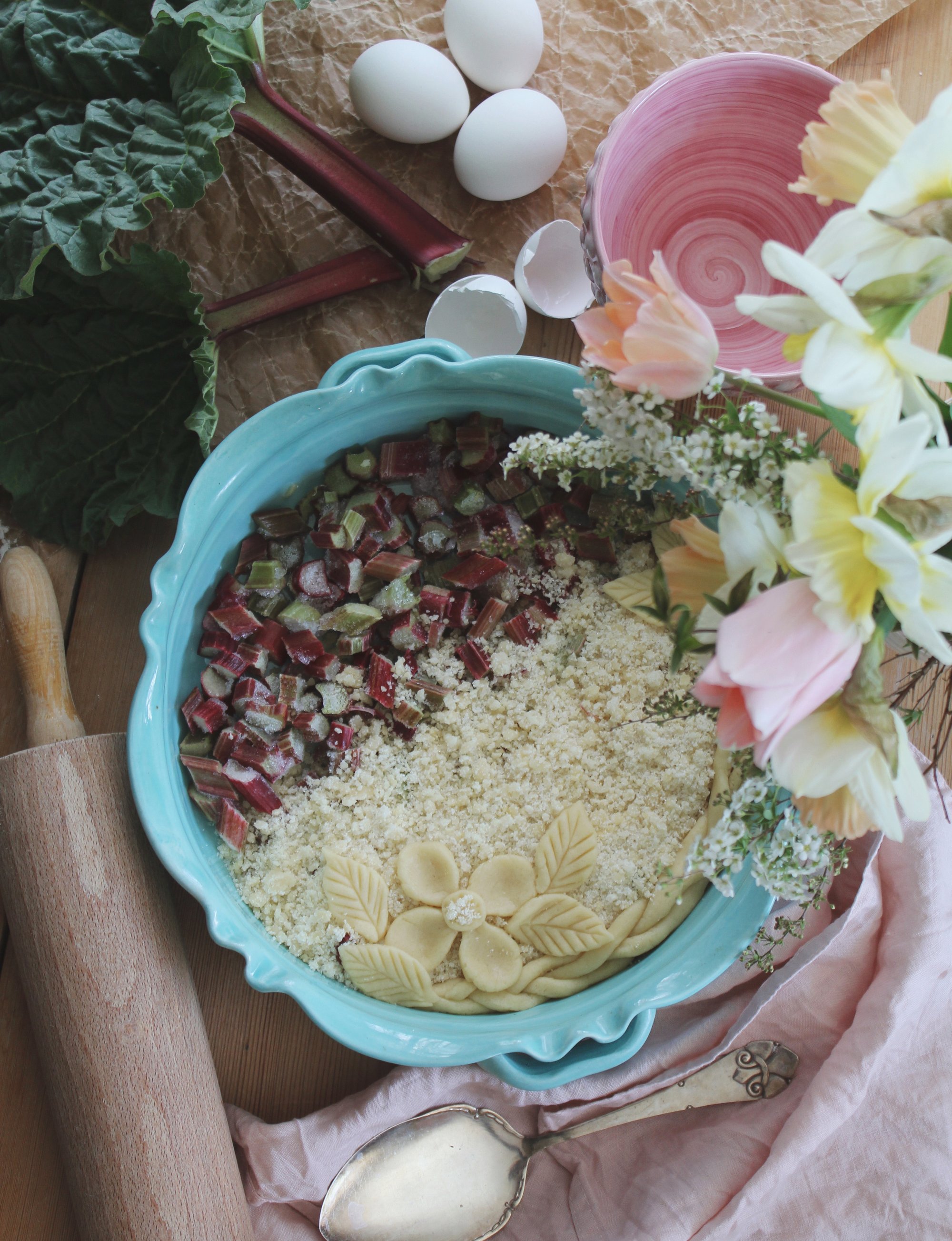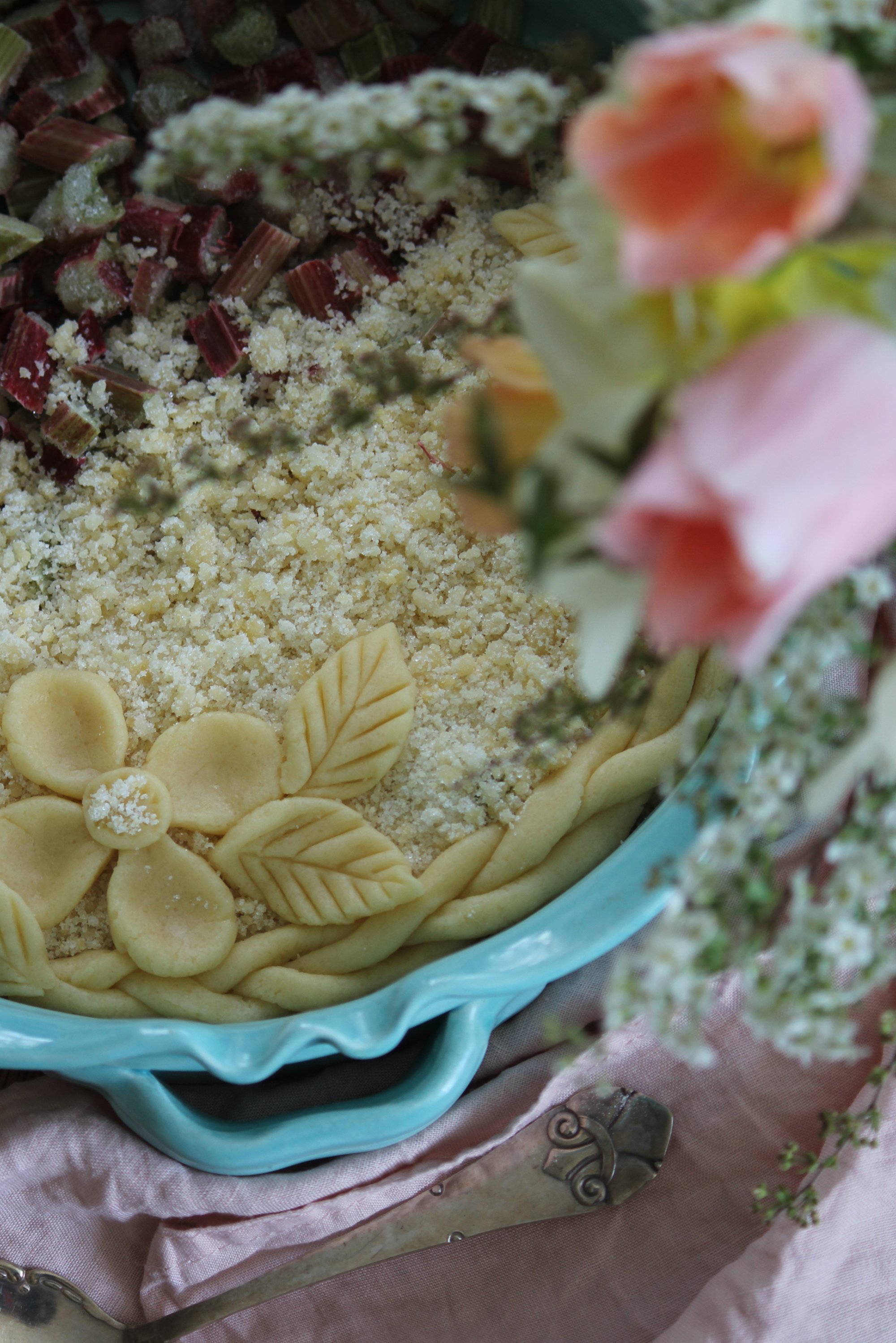 Kristi himmelfärdshelgen är i antågande och det betyder både sommarvärme och långledigt. Jag tänker att många kommer ta fram grillen och man vill kanske bjuda på en god dessert med smak av sommar. Den här pajen bara måste ni prova. Den har ett knäckigt pajlock som passar så bra till den syrliga rabarbern. Om du inte har rabarber i din trädgård så kanske du har i frysen från förra säsongen eller kan få tag på i din lokala mataffär. Annars går det lika bra med frysta hallon. För den som tycker om att dekorera brukar jag göra en deg vid sidan av till det. Denna gång fick det bli en blomma förstås. Tänker att rabarberpaj kan vara något man kan bjuda på hela sommaren ju. Passar till alla tillfällen. Serveras med kylskåpskall vaniljvisp. Här kommer receptet.