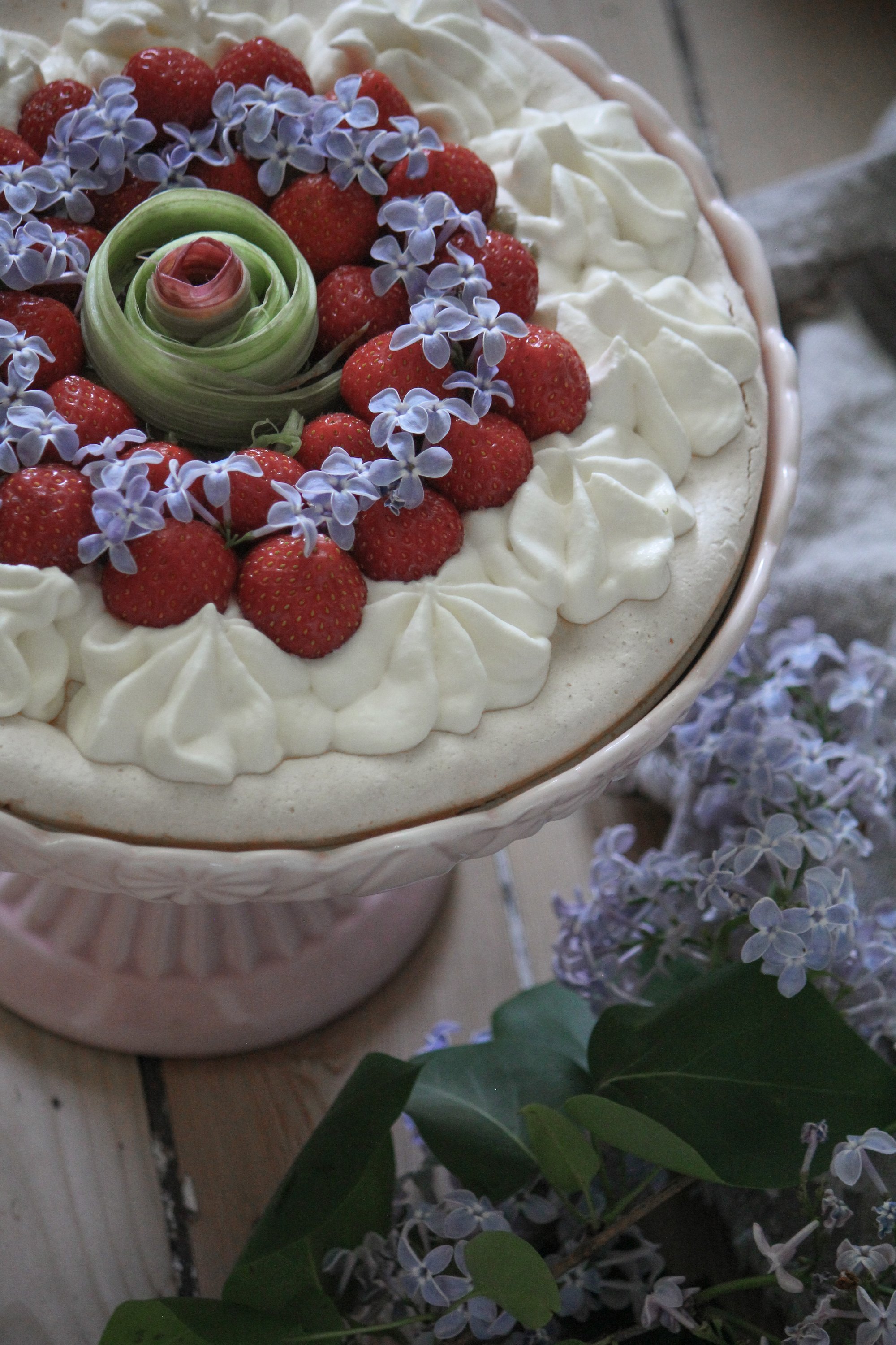 Dekorera Pavlovan dagen efter genom att spritsa ut citronmousse och fördela rabarberkompotten. Toppa med färska jordgubbar och eventuellt ätbara blommor. I mitten gjorde jag en enkel rabarberros med skalet som vi tog bort.