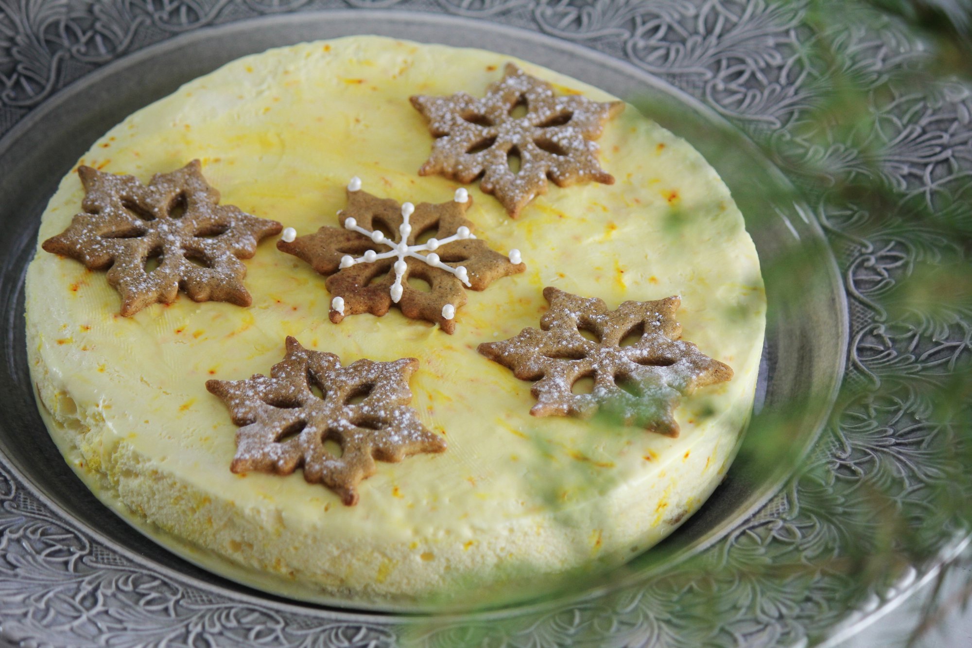 Min saffranscheesecake är både enkel att göra och jättegod! Den är dekorerad med pepparkakor som vi bakat. Tycker om snöflingsformen. Här kommer receptet.