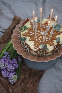 7. Dekorera tårtan när du tar fram den ur frysen. Den här har jag dekorerat med pepparkakssnöflingor som jag bakat tidigare men det är också fint att dekorera med t.ex. lingon eller varför inte halverade färska fikon och physalis. Eventuellt behöver den ställas fram lite innan man ska äta den ifall den är helt genomfrusen. Det är lite olika på olika frysar har jag märkt. Idag tog vi den direkt från frysen och den var lagom mjuk.