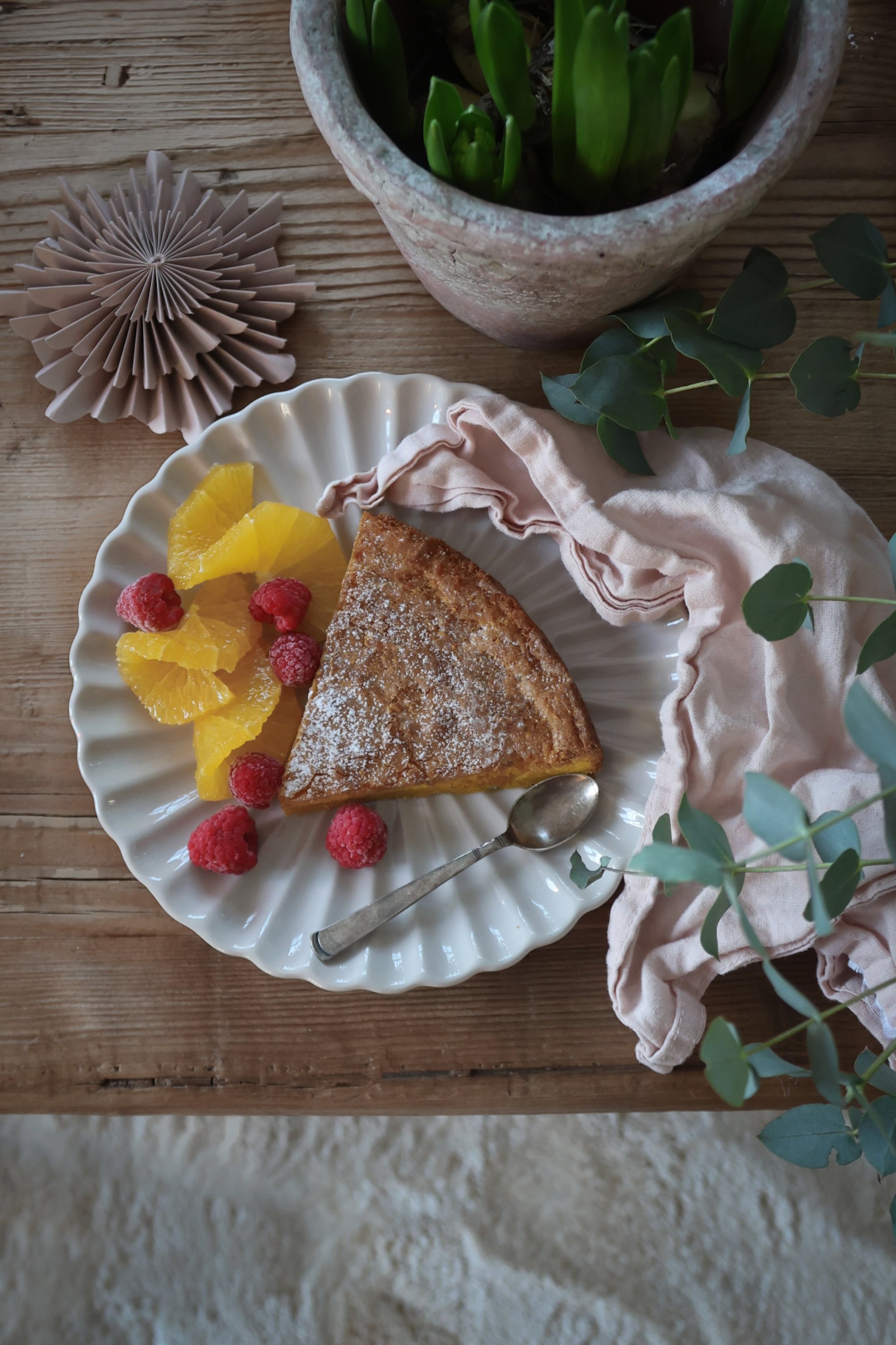 Saffranskladdkaka med vit choklad serveras med en apelsin och hallonsallad